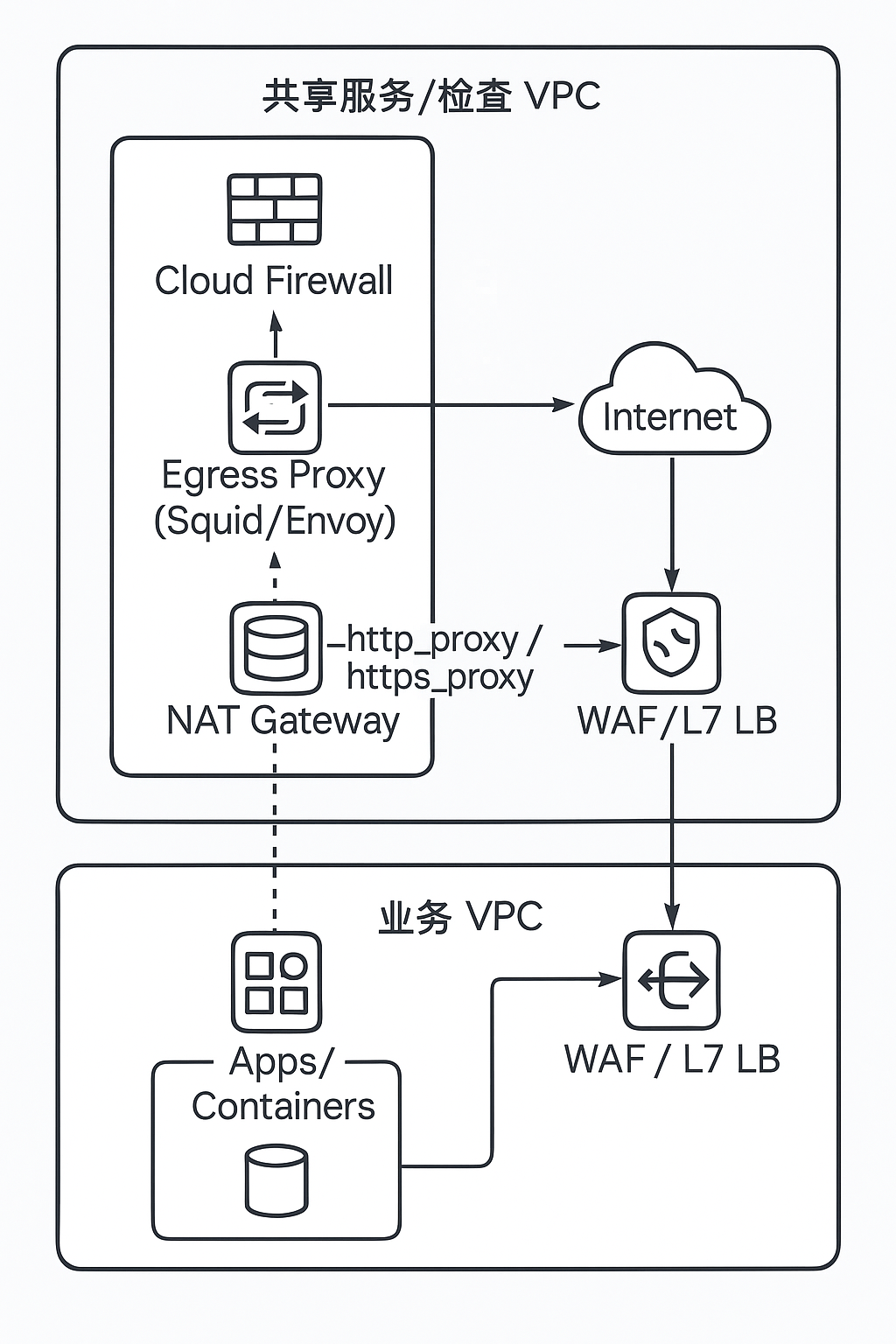 - Spoke VPC:业务应用通过 http_proxy/https_proxy 环境变量或透明代理,将出站流量统一导向 Proxy/NAT。