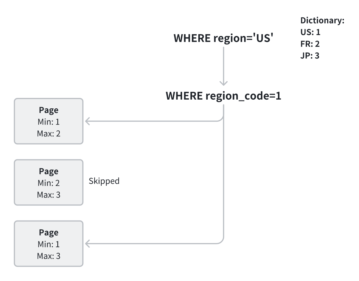 在查询执行阶段,StarRocks 会对字典编码数据进行谓词改写:例如 region='US' 会被改写为 region=1,然后利用索引直接过滤对应的数据块。这种方式避免了频繁的字符串比较,计算更轻量,内存与 I/O 效率均明显提升。