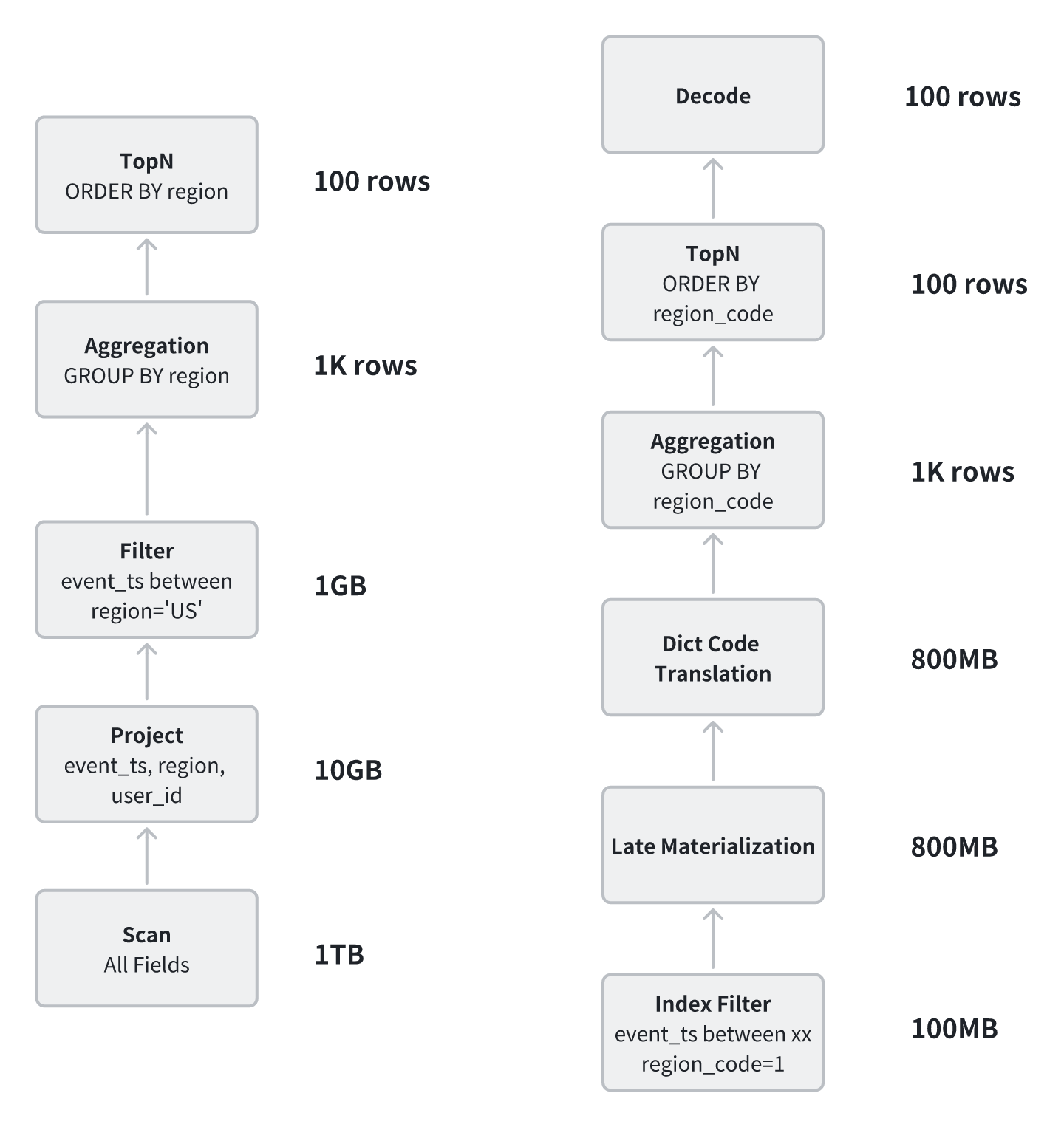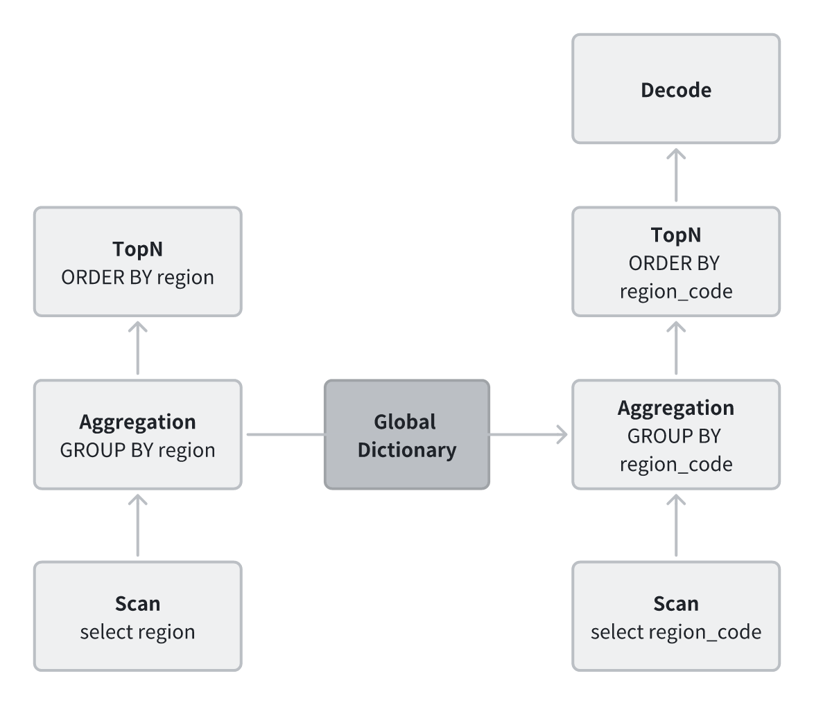 例如,原本的 GROUP BY region 操作需要在哈希表中频繁进行字符串查找和更新;使用全局字典后,执行计划可改写为 GROUP BY region_code,以整数完成聚合,仅在最终输出阶段再将整数解码为字符串,从而显著减少计算开销。