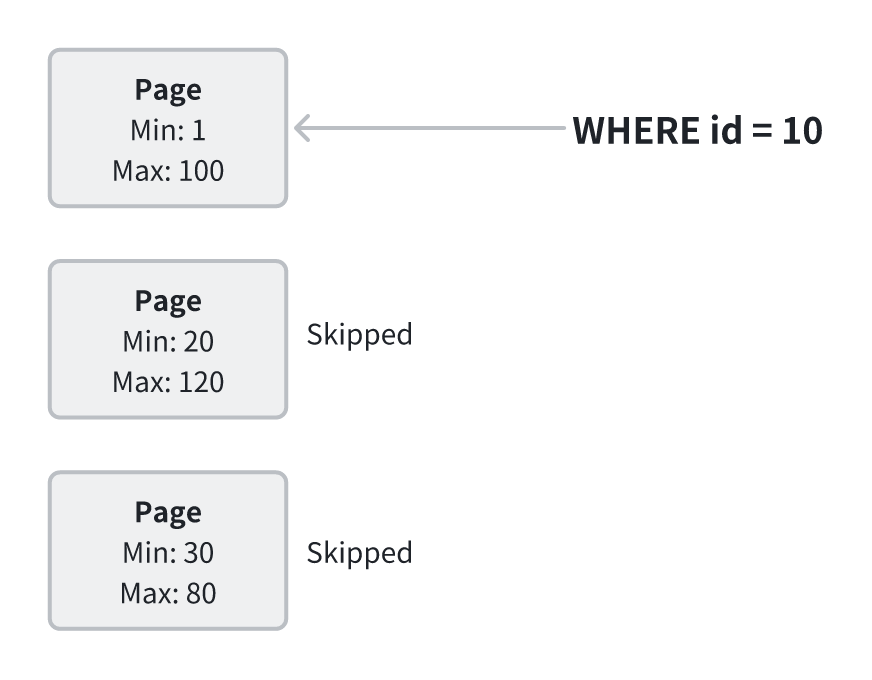 为避免全表扫描,FlatJSON 支持在已列化字段(如 region、event_time、event_type)上创建合适的索引,例如 ZoneMap。ZoneMap 会记录每个 Page 的最小值和最大值,在查询时可据此快速判断哪些 Page 可能命中过滤条件,从而跳过无关数据。