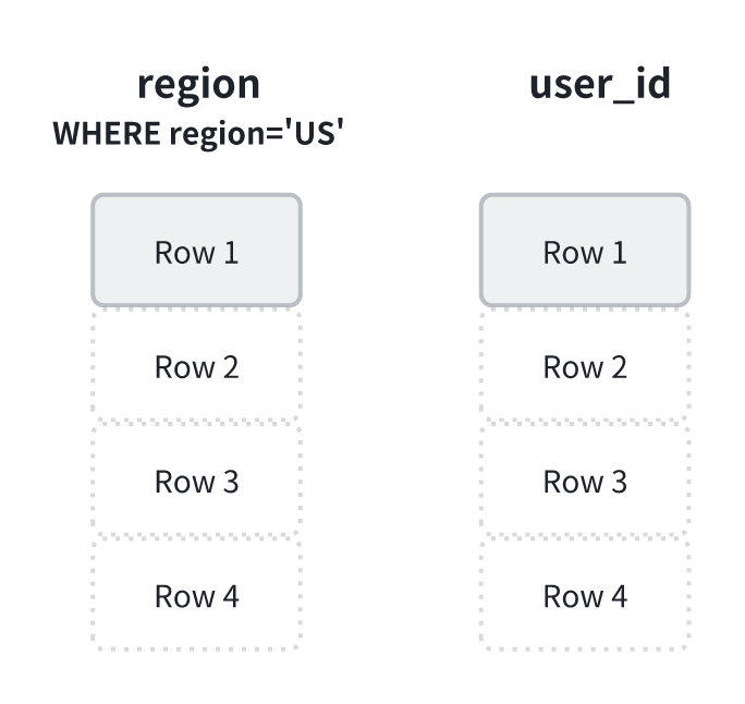 延迟物化的思路正好相反:在初始阶段仅使用轻量级的数据结构(例如行号)来表示记录,在完成所有过滤操作之后,再根据筛选结果去读取真正需要的列。以 region='US' 为例,StarRocks 会先读取并过滤 region 字段,仅记录满足条件的行号。随后再按照这些行号读取 user_id 字段,从而避免无谓的数据加载。