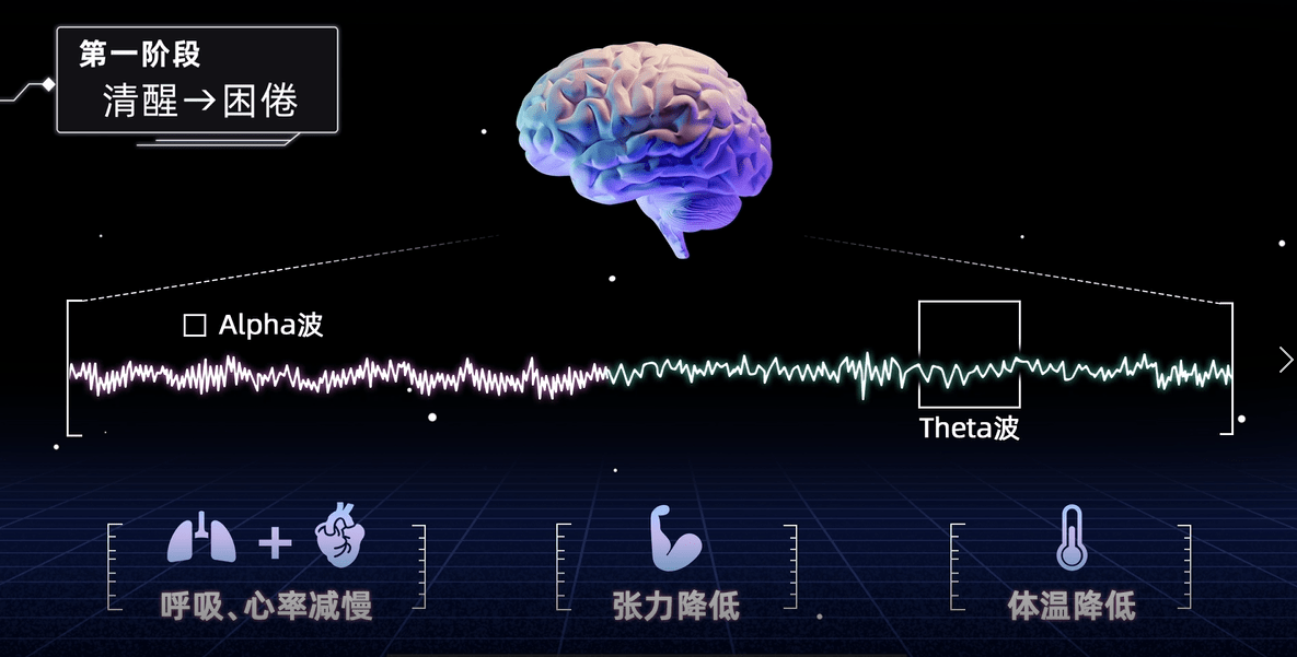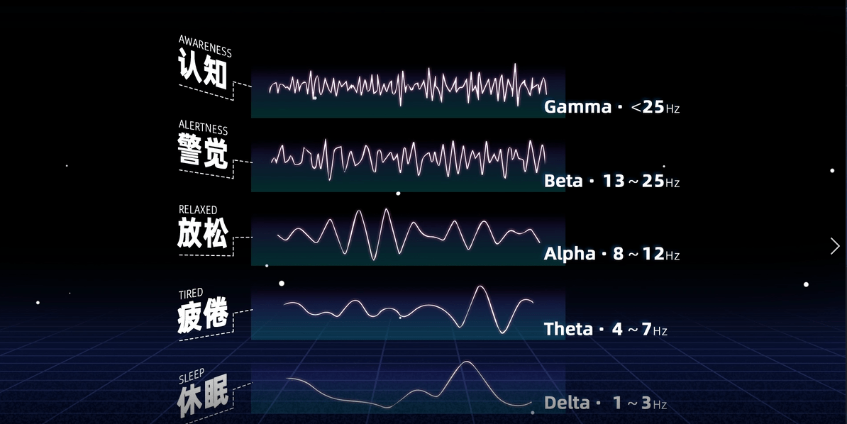 人体常见的脑电波有5种波段:认知(gamma)、警觉(beta)、放松(alpha)、疲倦(theta)、休眠(delta)。当我们入睡时,大脑并非一直处于休眠状态,根据脑电波的活动形式,睡眠大致分为4个阶段。