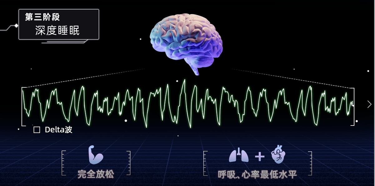 第三阶段通常被称为深度睡眠,其脑电波特点是低频、高振幅的 delta 波。在此期间,身体肌肉完全放松,心率和呼吸达到最低水平。此时,要将人从睡眠中唤醒,会比前两个阶段更困难。