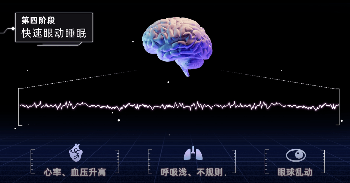 第四阶段是快速眼动睡眠(REM),与前三个阶段相比,人的心率和血压升高,呼吸浅而不规则,眼球快速运动。此阶段大脑高速运转,脑电波高频波动,与清醒期非常相似,大部分生动具体的梦都发生在这个阶段,身体除了呼吸以外陷入麻痹状态,人陷入梦中,无法行动。