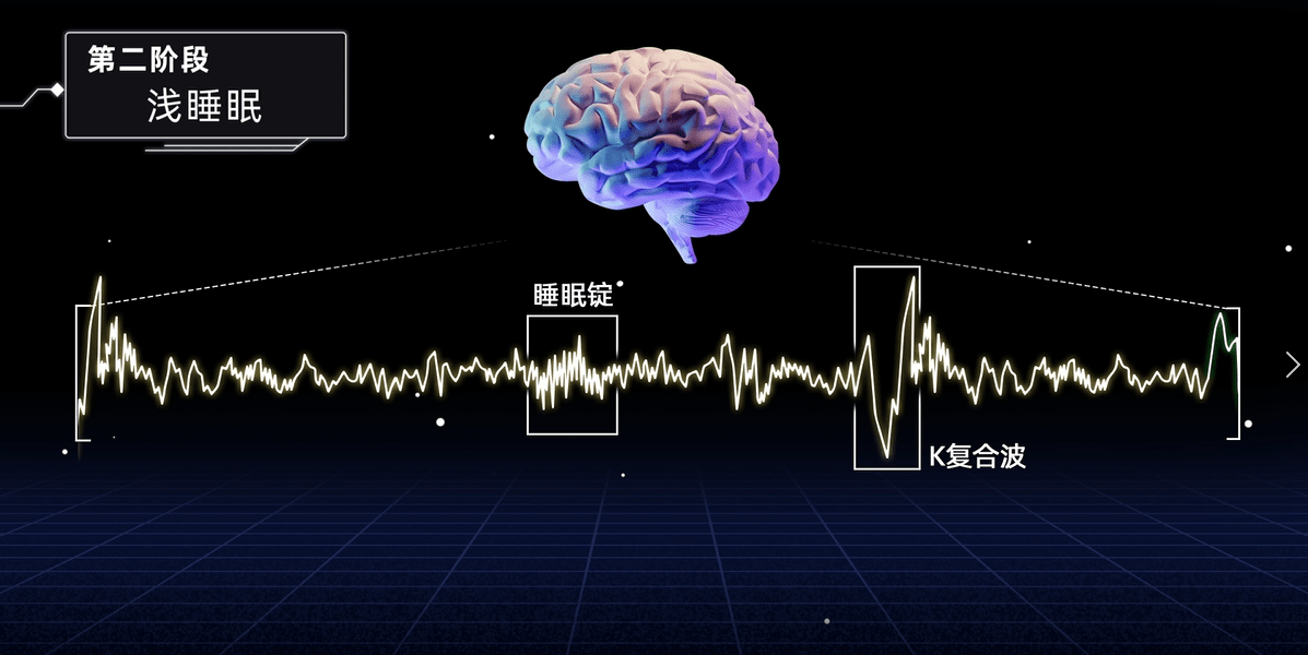 第二阶段进入浅睡眠,身体深度放松,这时脑电波图呈现theta波主导,同时可能出现快速爆发的高频“睡眠锭”以及K复合波,这两种脑电波可以保护大脑,避免从睡眠中醒来。
