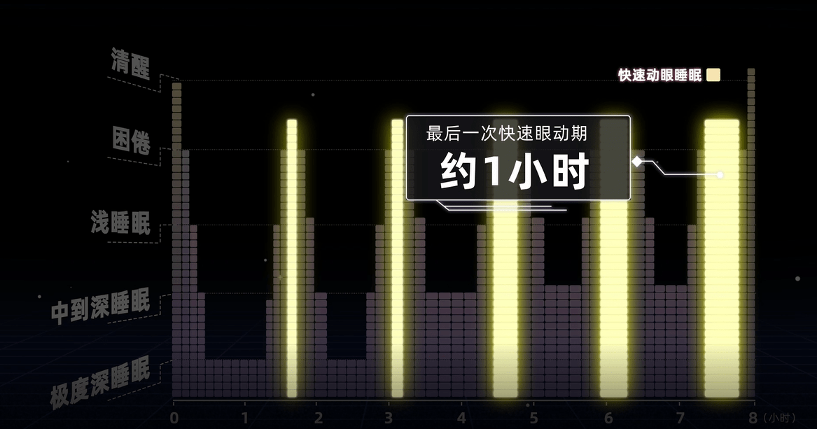 在整夜4-5个睡眠周期中,第一次的快速眼动期仅持续约10 分钟,随着临近黎明,每个快速眼动期都会变得更长,最后一次可能会长达一个小时,这也是我们通常只记得醒来前最后一个梦的原因。
