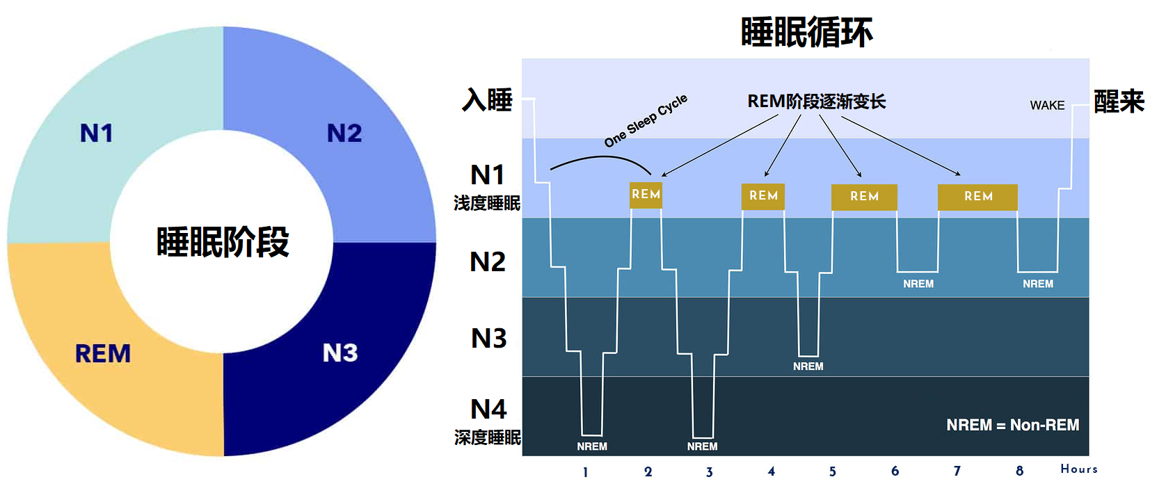 前三阶段的非快速眼动睡眠与第四阶段的快速眼动睡眠交替进行,称为一个睡眠周期。在8小时睡眠中,通常有 4~5个睡眠周期,每个周期持续约90-120分钟。