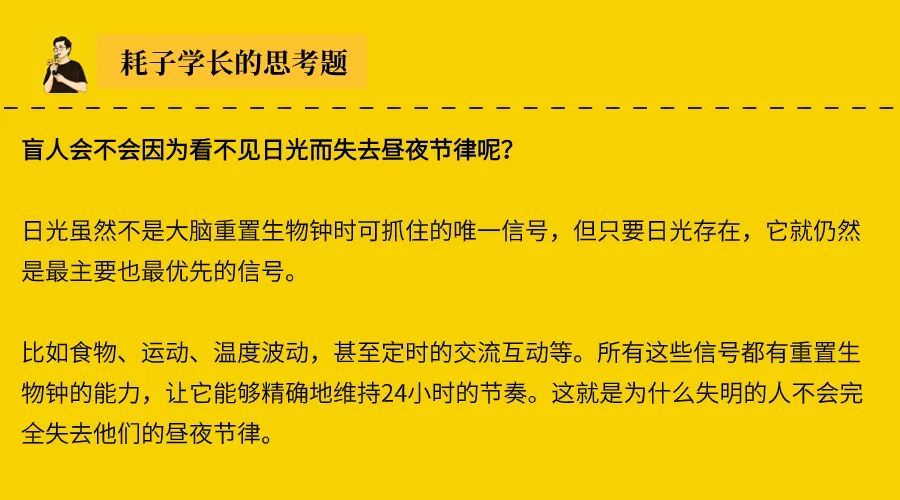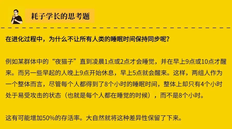 科学研究发现,成年人的熬夜性或早起性是由基因决定的。我们经常提及早睡早起,其实很多时候是由社会活动(比如苦命打工人,上班需要打卡)被迫养成的。
