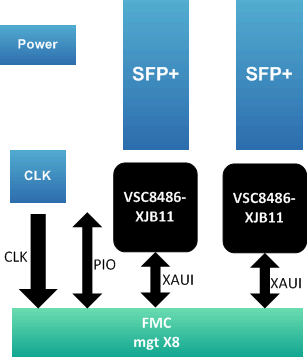 2.性能指标 2.1 SFP+介绍 2.1.1 接口卡标准采用2路SFP+; 2.1.2 两路接xaui接两路10G phy输出给SFP+; 2.1.3 时钟由fmc板卡提供156.25MHZ时钟给主板 2.2 接口介绍 2.2.1 接口支持FMC标准的HPC连接器,支持 EMIF 64bit宽度,同步100MHz传输;Mcpbs0;Mcbsp1;RapidIO X4。 2.2.2 接口支持FMC标准的LPC连接器 支持EMIF32bit宽度,同步100MHz,Mcbsp1,RapidIOX1,Flash仅支持4MB。(本卡默认为LPC) 2.2.3 连接电源 +12V,+3.3V 。板卡独立供电+5V--+12V均可,模块