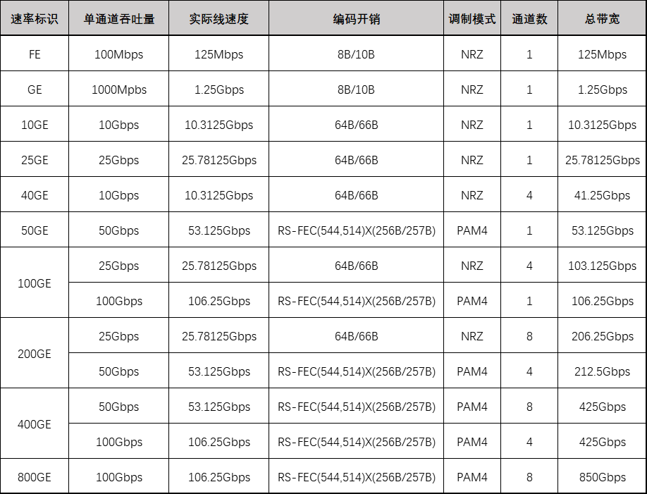 以太网是一种计算机局域网技术。IEEE组织的IEEE 802.3标准制定了以太网的技术标准,它规定了包括物理层的连线、电子信号和介质访问层协议的内容,是光模块设计研发的重要标准之一。之前的文章800G/1600G及以下以太网协议整理整理了40G-1.6T以太网物理层协议。今天我们将开启全新文章系列,以表格等形式整理以太网和IB网络协议物理层参数,为客户在以太网物理层设备开发或光模块选型提供快速参考。本文整理的是100M~800G以太网物理层光层吞吐量、线速度、编码开销、带宽。1.6T以太网的规范IEEE802.3dj尚未正式公布,未列出。部分协议有多种FEC可选,本次整理选用开销最大的种类。