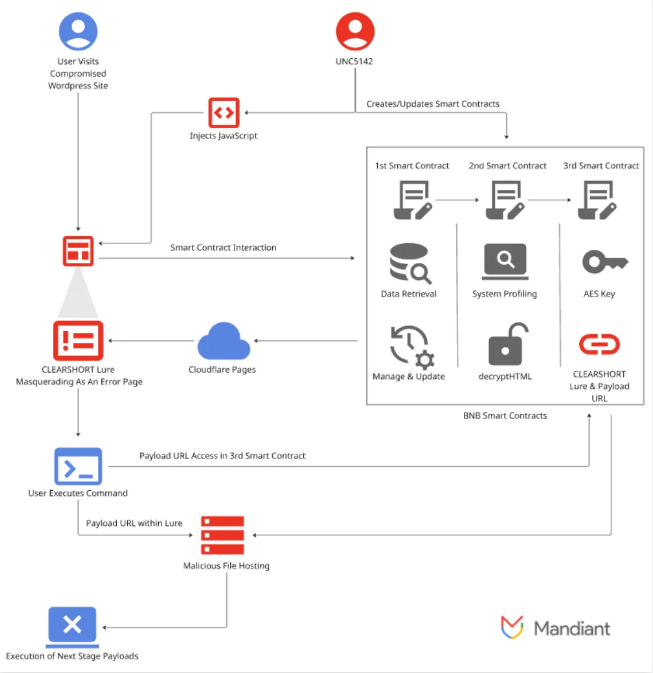谷歌威胁情报团队(GTIG)在分享给《黑客新闻》的报告中表示:“UNC5142 的显著特征是利用已被入侵的 WordPress 网站,以及‘EtherHiding’技术 —— 这种技术通过将恶意代码或数据存储在币安智能链(BNB Smart Chain)等公共区块链上实现隐藏。”