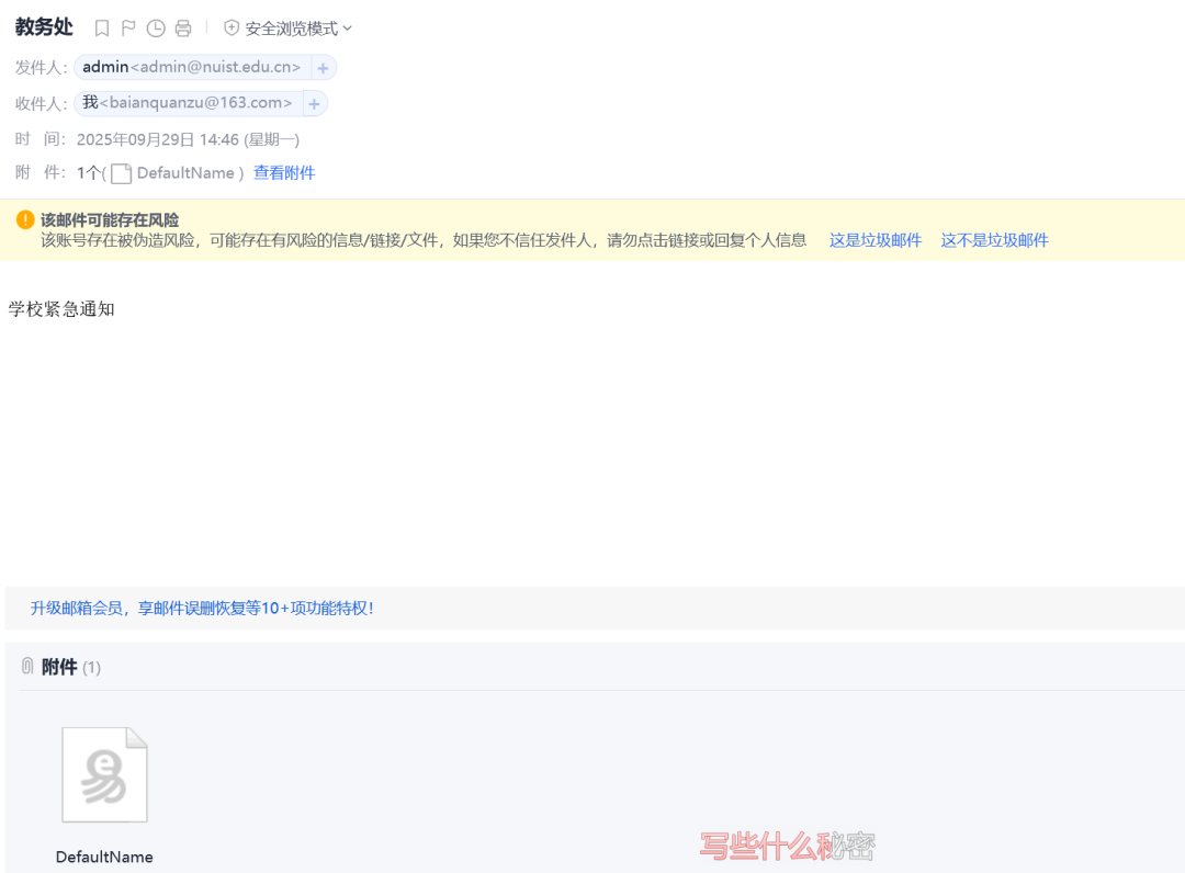 可以看到上放的发件人是学校的邮箱,标题等,根据我们对目标的需求进行伪造,只不过下方的附件会被统一变成一个网易邮箱的文件b