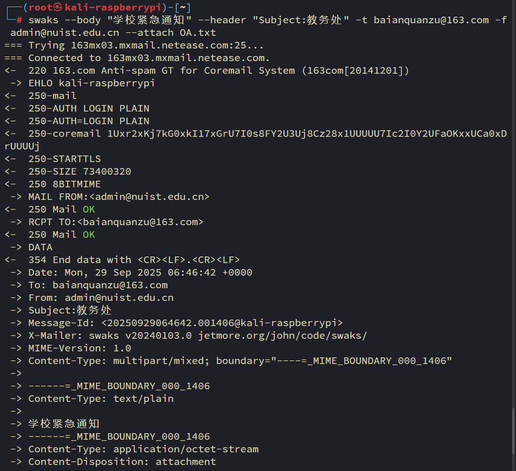 swaks --body "学校紧急通知" --header "Subject:教务处" -t baianquanzu@163.com -f admin@nuist.edu.cn --attach post.txtbody参数是发送过去邮件的内容