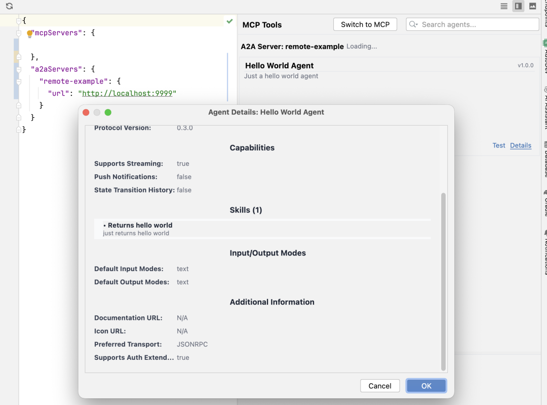 /a2a:remote-example ```json { "agent": "Hello World Agent", "message": "Please review this code for potential security vulnerabilities" } ``` 相似的,我们也为 A2A 添加了 Debugger 的能力。只需要创建同样的 *.mcp.json 文件,然后点击切换 A2A 就可以进行简单的测试了: