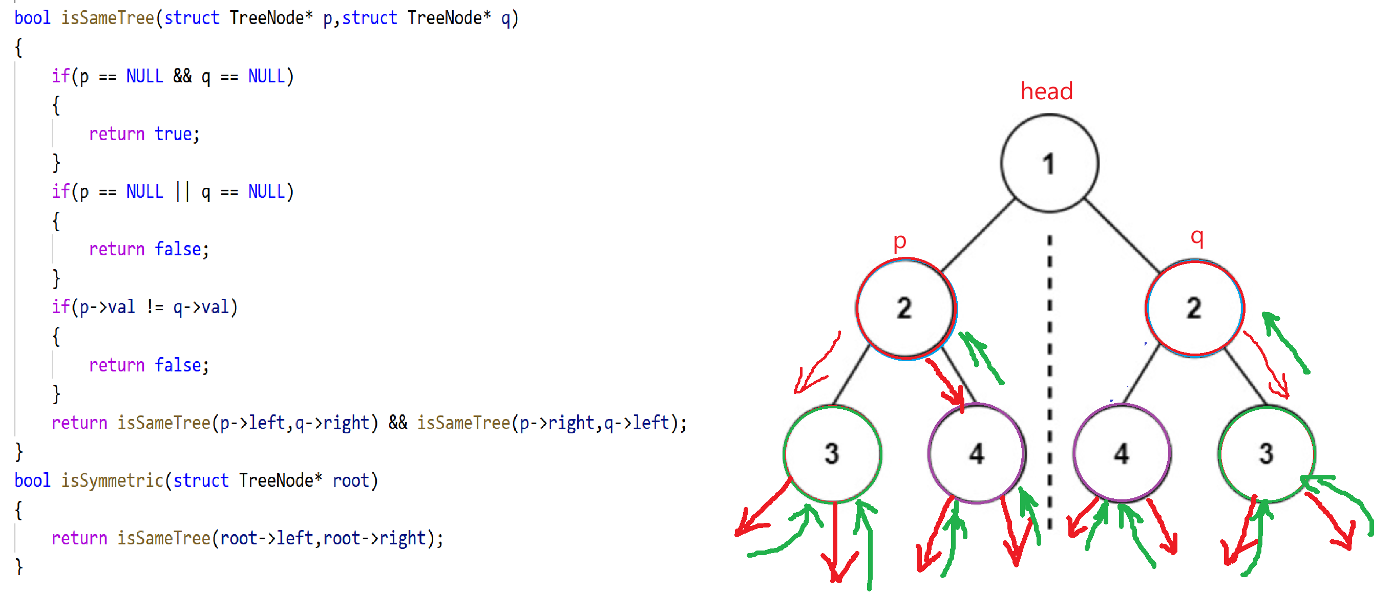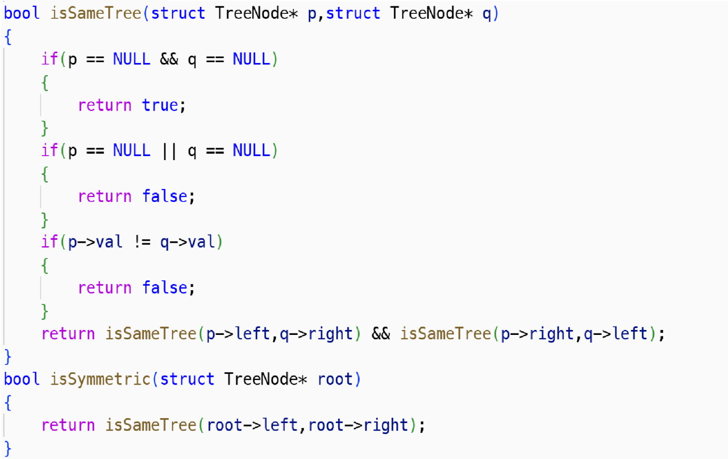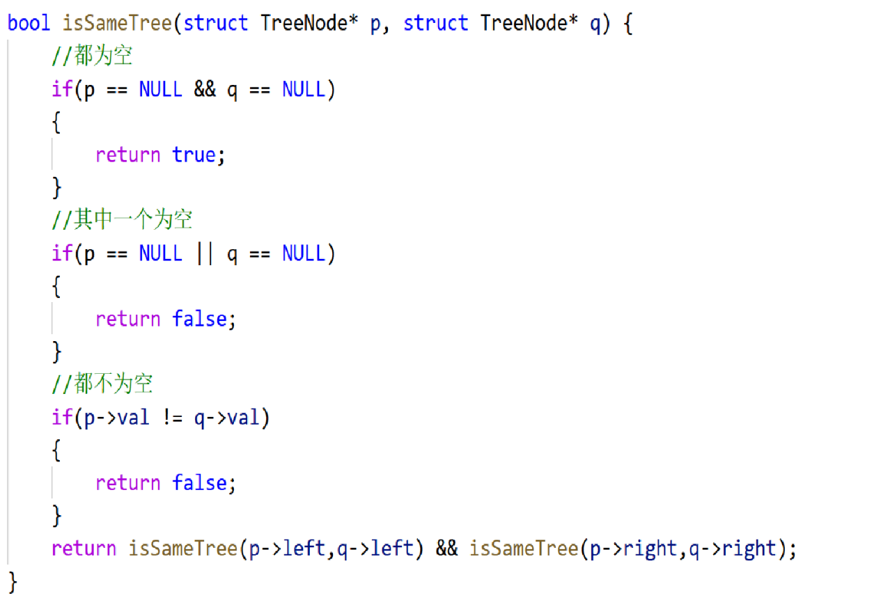 return isSameTree(p->left,q->left) && isSameTree(p->right,q->right);
