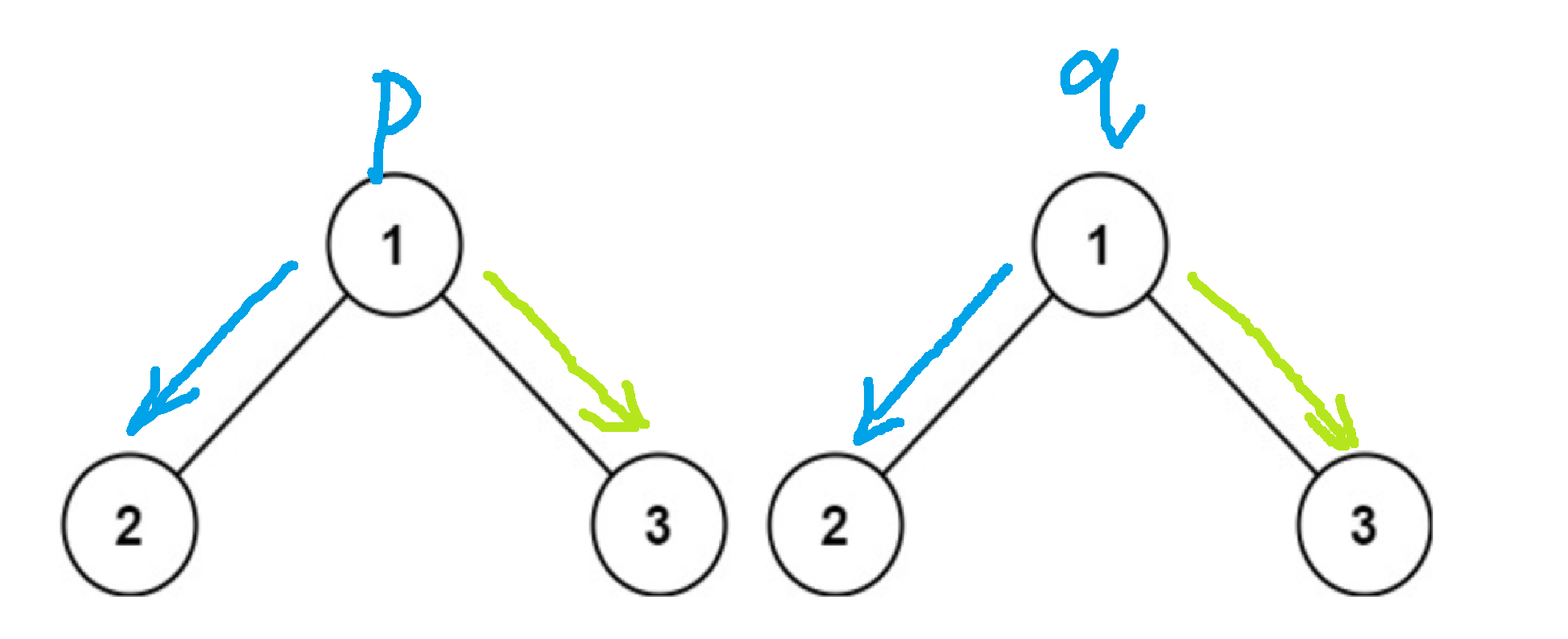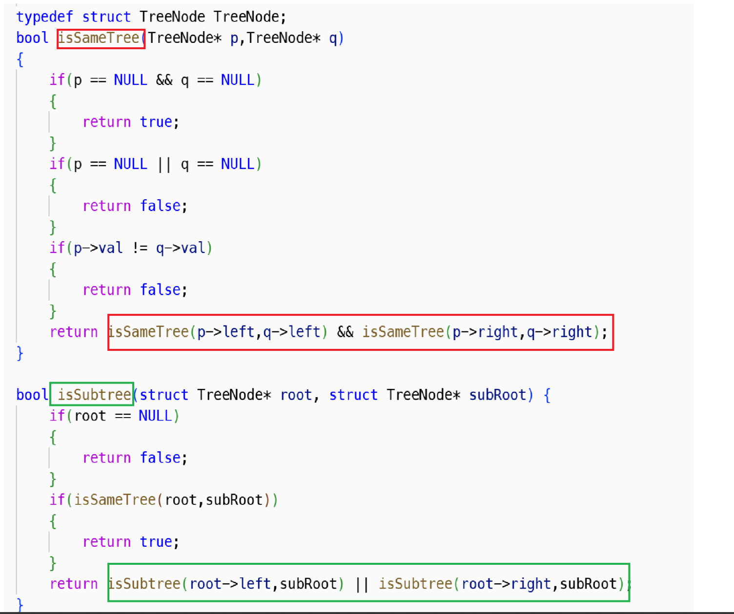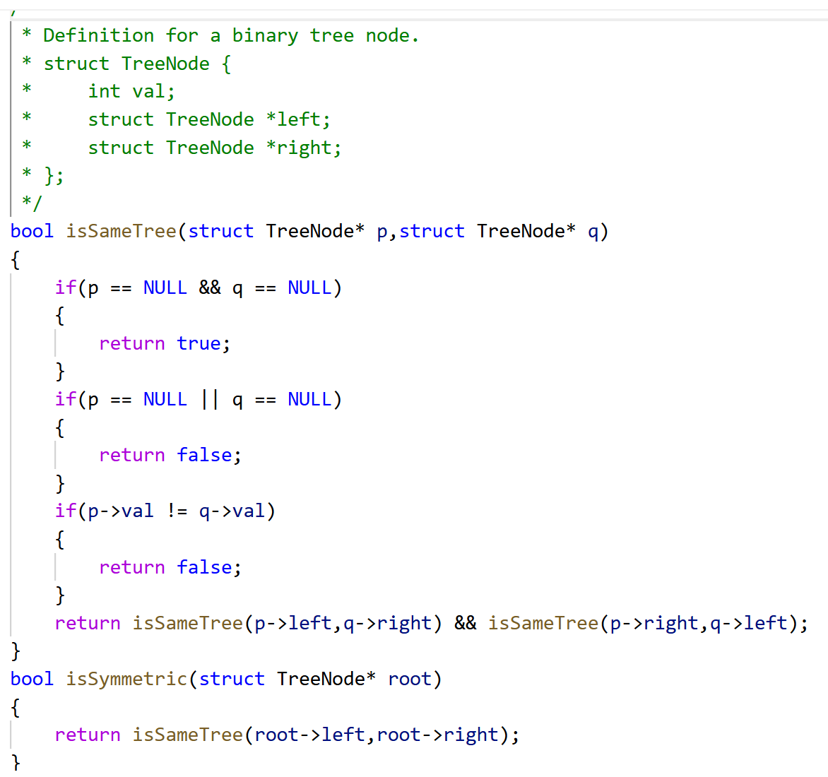 return isSameTree(p->left,q->left) && isSameTree(p->right,q->right);