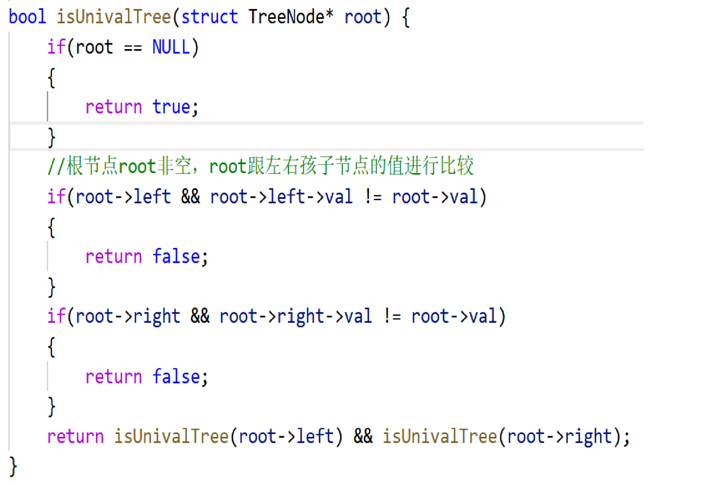 return isUnivalTree(root->left) && isUnivalTree(root->right);