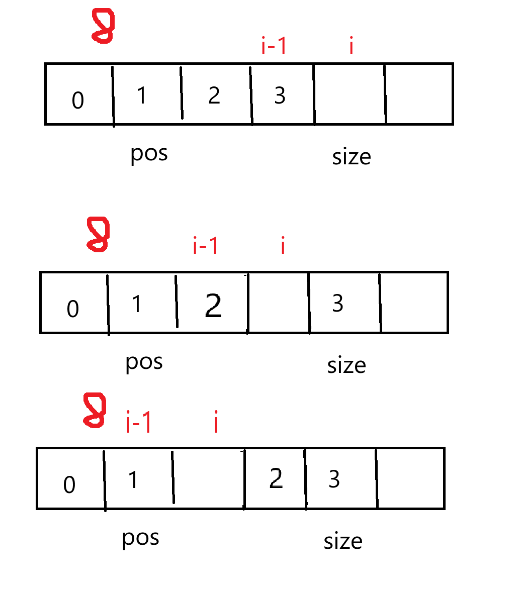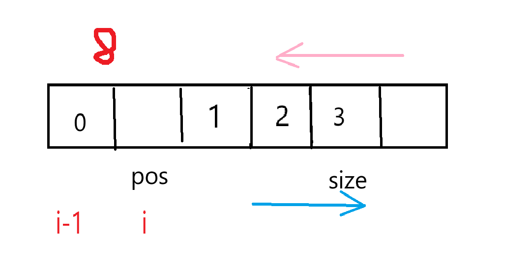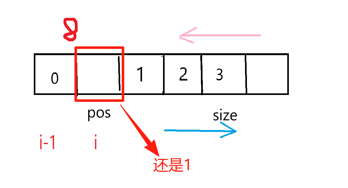 接下来就不能挪了,因为我只把pos及之后的数据往后挪动,也就意味着当i刚好等于pos的时候我们就不能再挪动数据了。