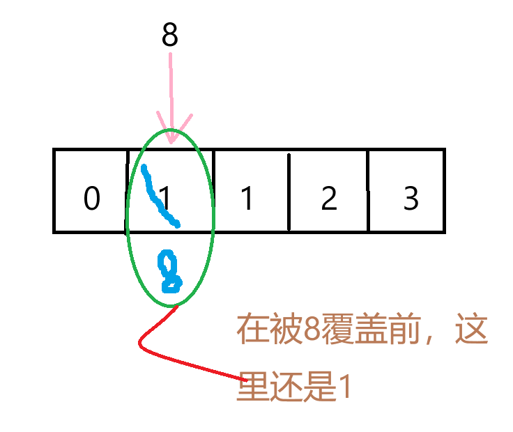 总之,我们在1之前插入一个8,后面的元素往后挪了,1虽然往后挪了,但是——