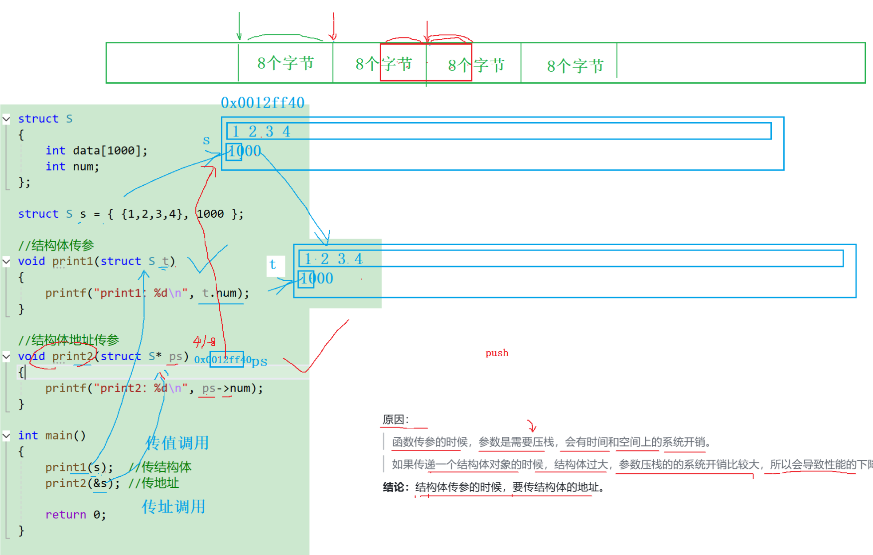 即 1、函数传参的时候,参数是需要压栈的,会有时间和空间上的系统开销; 2、如果传递一个结构体对象的时候,结构体过大,参数压栈的系统开销会比较大,所以会导致性能的下降。
