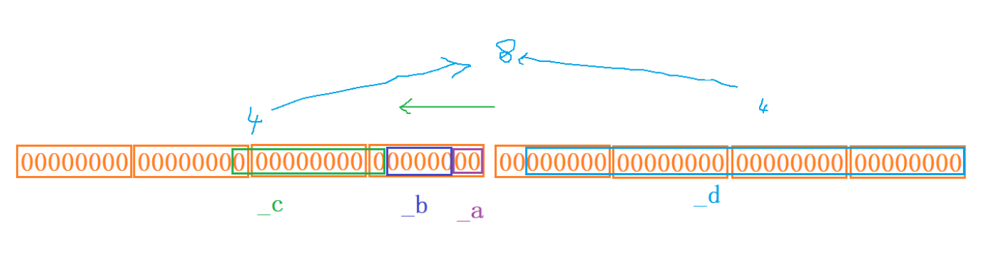 这里八个字节相当于每个成员只分配给它两个字节,成员们都不可能完整地占四个字节,像_a,它能表示的值我们就只能写出这四种: