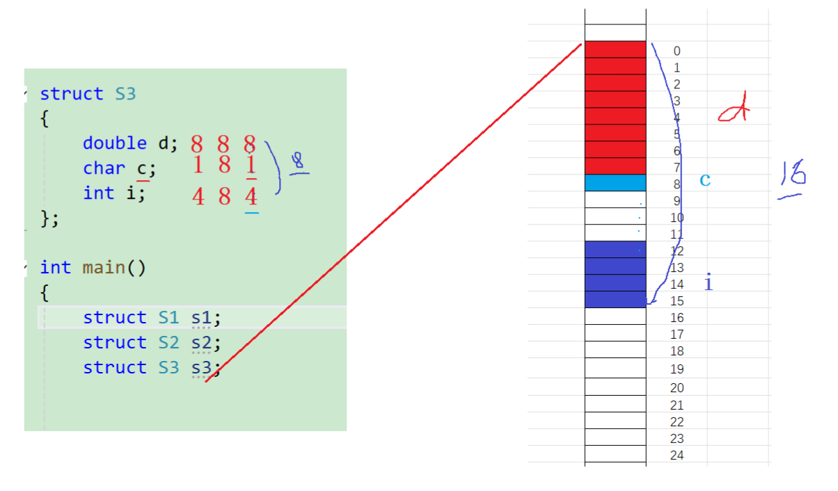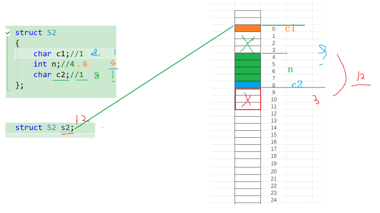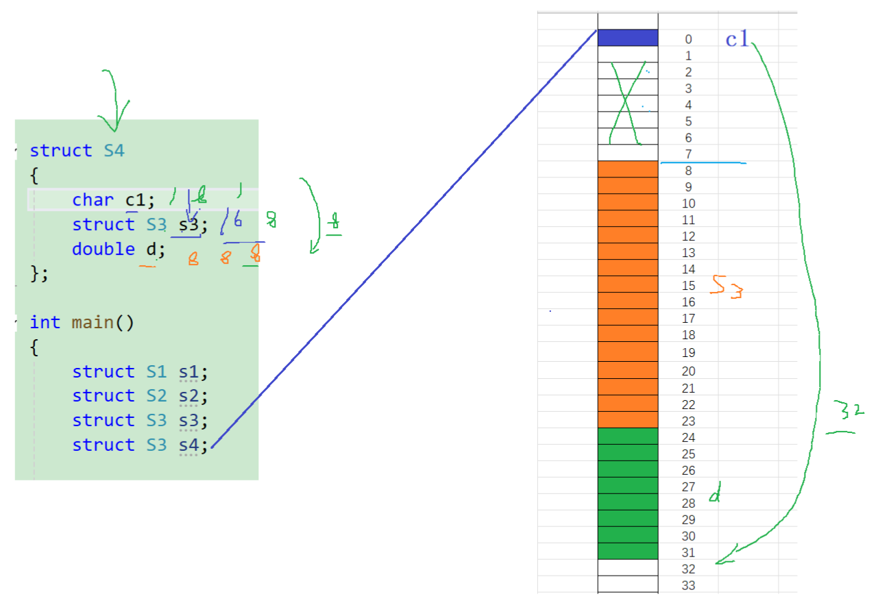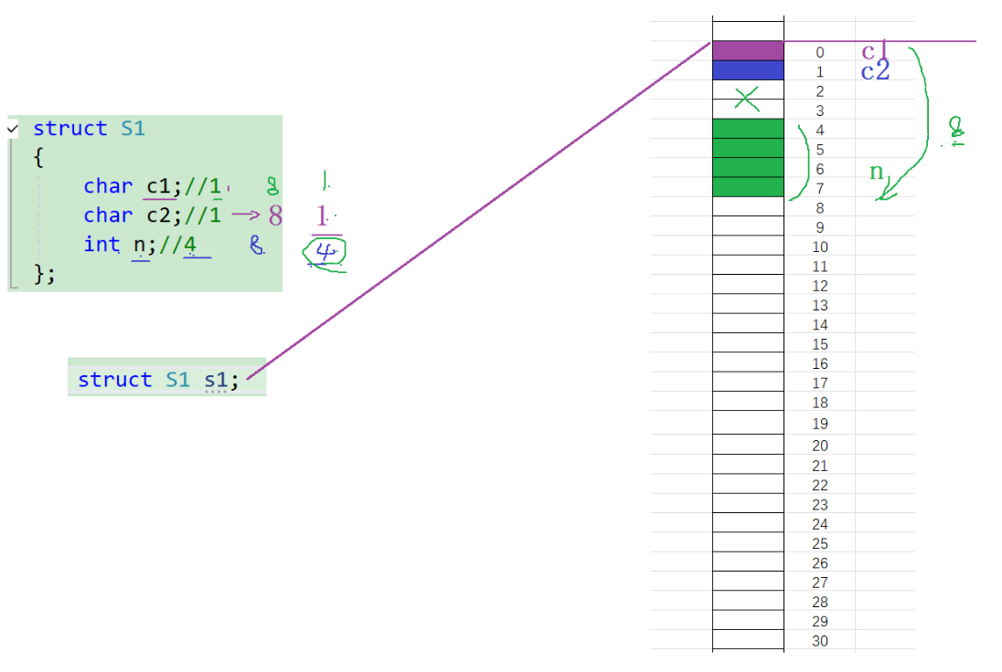 1、结构体的第一个成员对齐到和结构体变量起始位置偏移量为0的地址处; 2、其他成员变量要对齐到某个数字(对齐数)整数倍的地址处; 对齐数 = 编译器默认的一个对齐数与该成员自身的较小值; VS中默认的值为8 Linux中gcc没有没人对齐数,对齐数就是成员自身的大小 3、结构体总大小为最大对齐数(结构体中每个成员变量都有一个对齐数,所有对齐数中最大的)的整数倍; 4、如果嵌套了结构体的情况,嵌套的结果体成员对齐到自己的成员中最大对齐数的整数倍处,结构体的整体大小就是所有最大对齐数(含嵌套结构体中成员的对齐数)的整数倍。