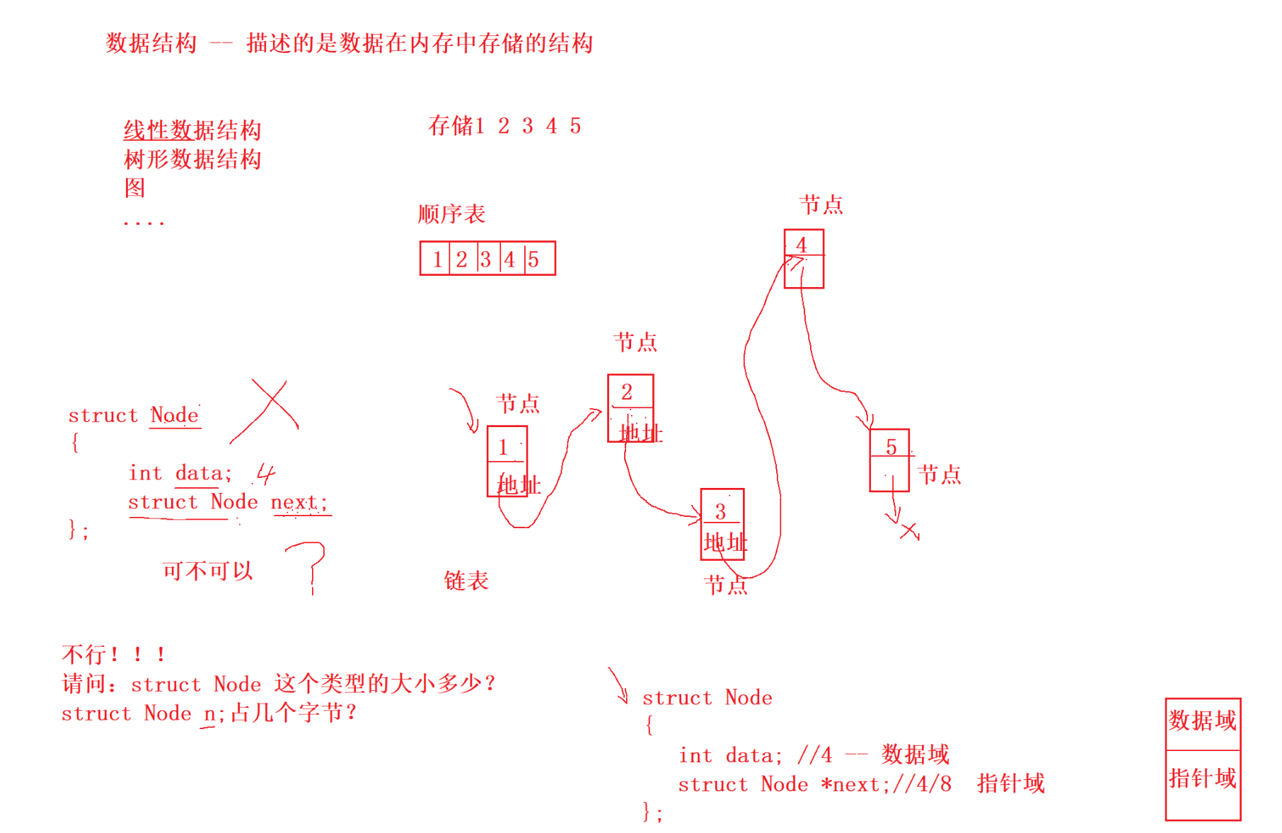 };这个代码对吗?仔细想想,是不行的,因为一个结构体再包含一个同类型的结构体变量,这样结构体变量的大小就会无穷大,这是不合理的。