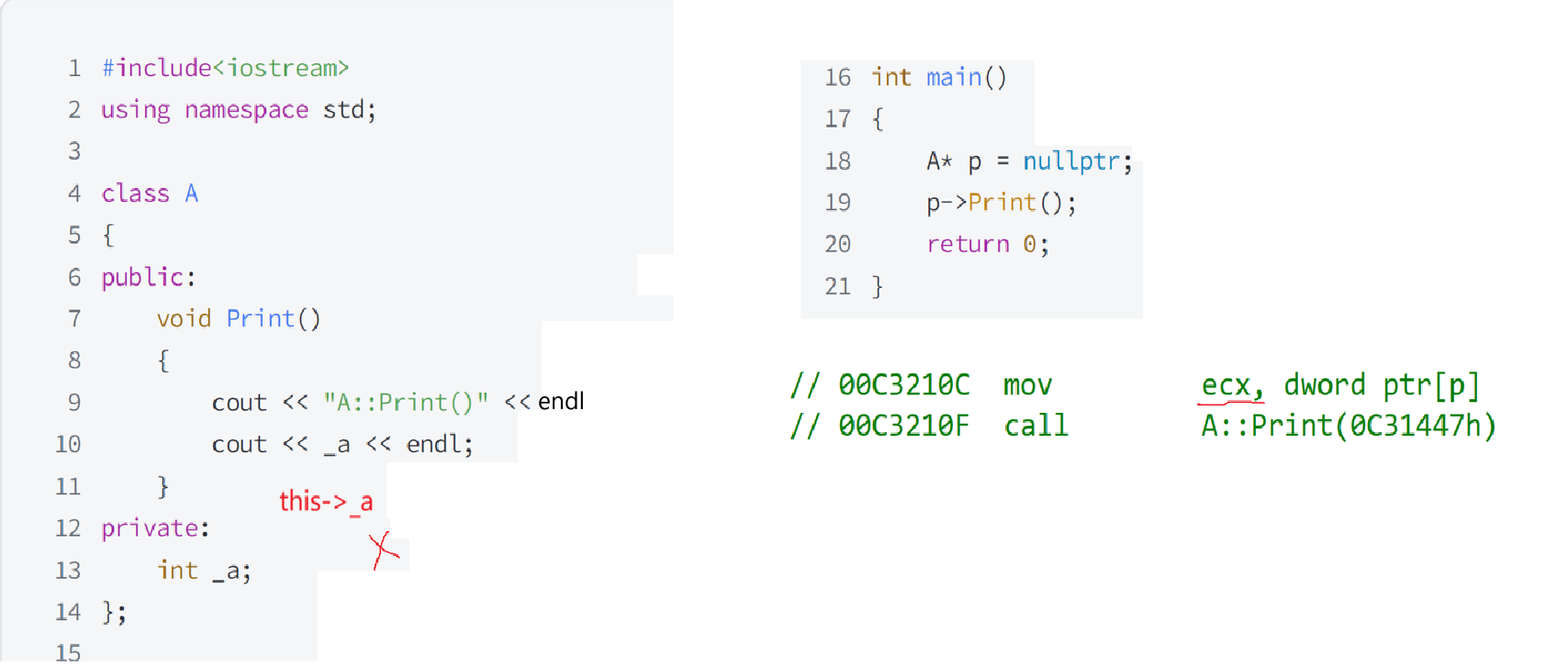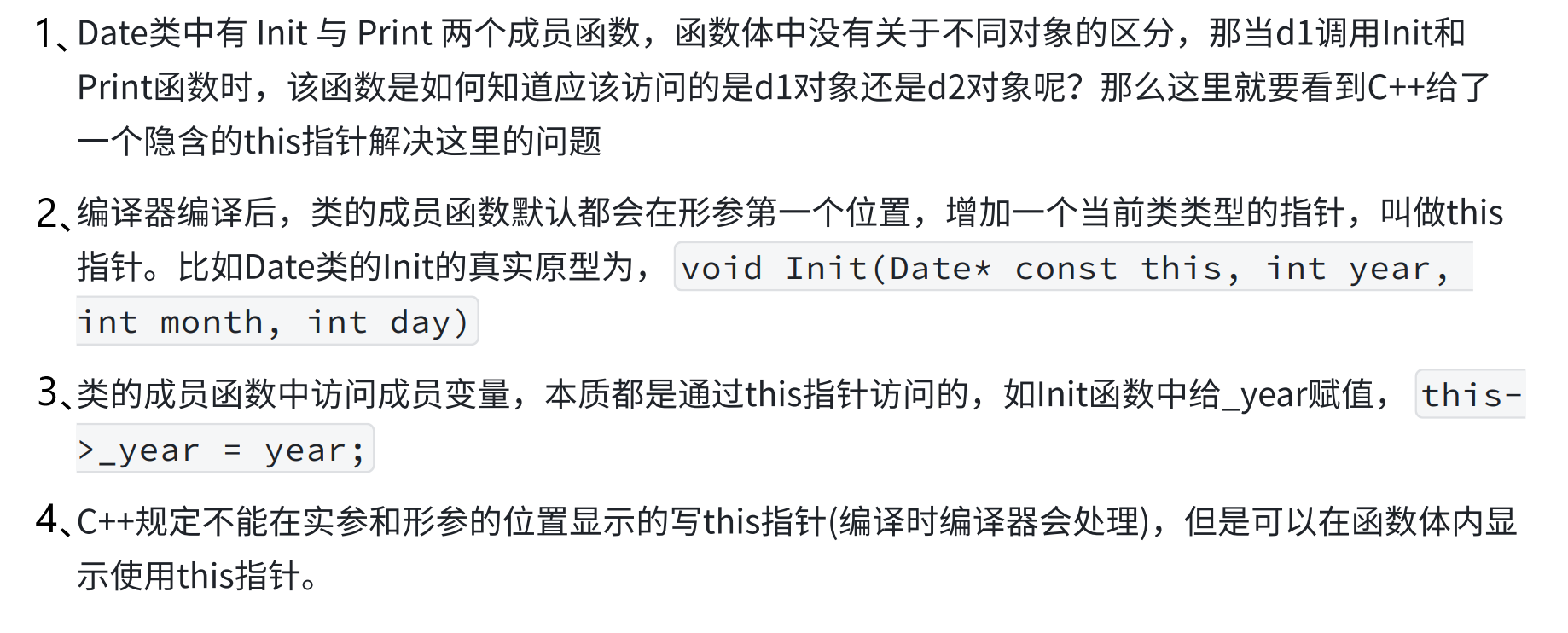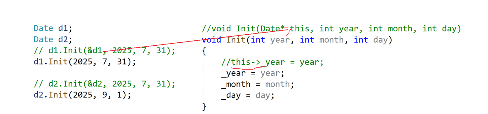 首先,函数被编译后是一段指令,对象中没办法存储,这些指令会被存储在一个单独的区域(即代码段中),那么对象中非要存储的话,只能是成员函数的指针。我们再再分析一下,对象中是否有存储指针的必要呢?Date实例化d1和d2两个对象,d1和d2都有各自独立的成员变量,_year、_month、_day存储各自的数据,但是d1和d2的成员函数Init/Print指针却是一样的,这要是存储在对象中可就浪费了。如果用Date实例化100个对象,那么成员函数指针就重复存储100次,实在是太浪费了。这里博主需要再额外解释一下,其实函数指针是不需要存储的,函数指针是一个地址,调用函数被编译成汇编指令[call 地址],其实编译器在编译链接时,就要找到函数的地址,不是在运行时找,只有动态多态是在运行时找,就需要存储函数地址,多态我们之前也说过,之后会详细介绍。