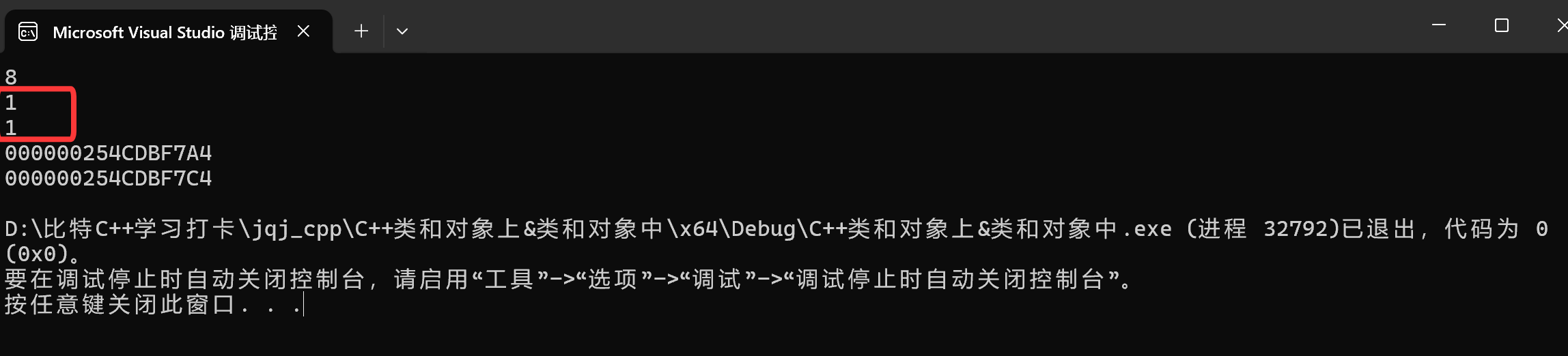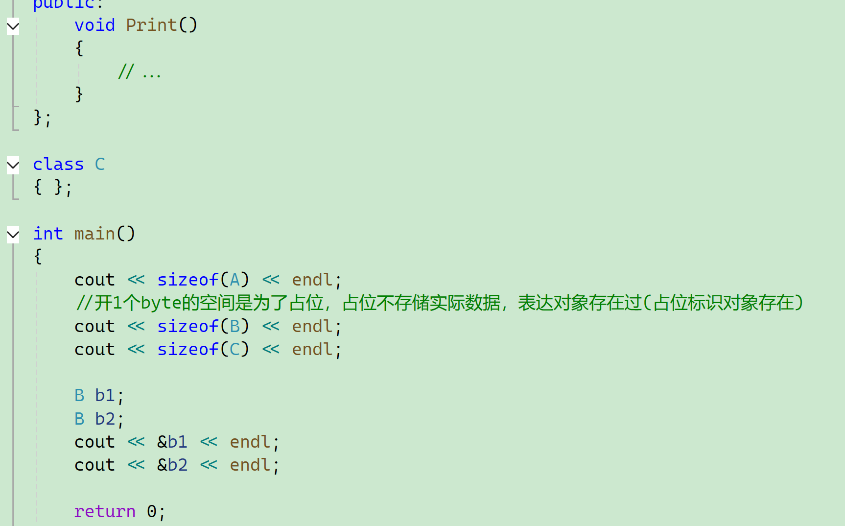 程序运行后,我们看到没有成员变量的B和C类对象的大小是1,为什么没有成员变量还要给1个字节呢?因为如果一个字节都不给,如何表示对象存在过呢!因此这里给1字节,纯粹是为了占位标识对象存在,就是标识一下。
