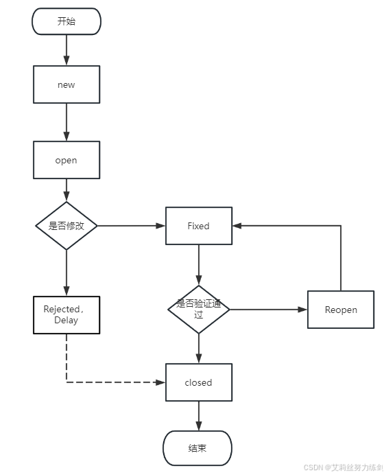New:新发现的Bug,未经评审决定是否指派给开发人员进行修改。 Open:确认是Bug,并且认为需要进行修改,指派给相应的开发人员。 Fixed:开发人员进行修改后标识成修改状态,有待测试人员的回归测试验证。 Rejected:如果认为不是Bug,则拒绝修改。 Delay:如果认为暂时不需要修改或暂时不能修改,则延后修改。 Closed:修改状态的Bug经测试人员的回归测斌验证通过,则关闭Bug。 Reopen:如果经验证Bug仍然存在,则需要重新打开Bug,开发人员重新修改。 无效的bug:open->closed open-rejected-closed