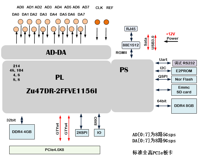 ● 基于Zynq RFSoC系列FPGA,支持8路最高5G ADC和8路最高9G的DAC; ● 支持外部时钟输入1路, 外触发,外同步各1路; ● PL 1组64 bit 2400M DDR4,支持PL部分高速存储和处理。 单组4GB字节容量,PL部分8GB字节容量。 ● 支持16个GPIO PS部分内容: ● PS部分1组64bit位宽DDR4,单组4GB字节 ● 可配置的Dual QSPI 加载 ● 支持MicroSD卡加载 ● 1000Base-T以太网(RJ45)端口(CPU端) ● USB接口支持,调试RS232 1路, ● 标准PCIe全高半长板型(167 x 111 mm ),适配常见主机、服务器 ● PCIe Gen4 x8,高速数据通讯,附带DMA传输例程