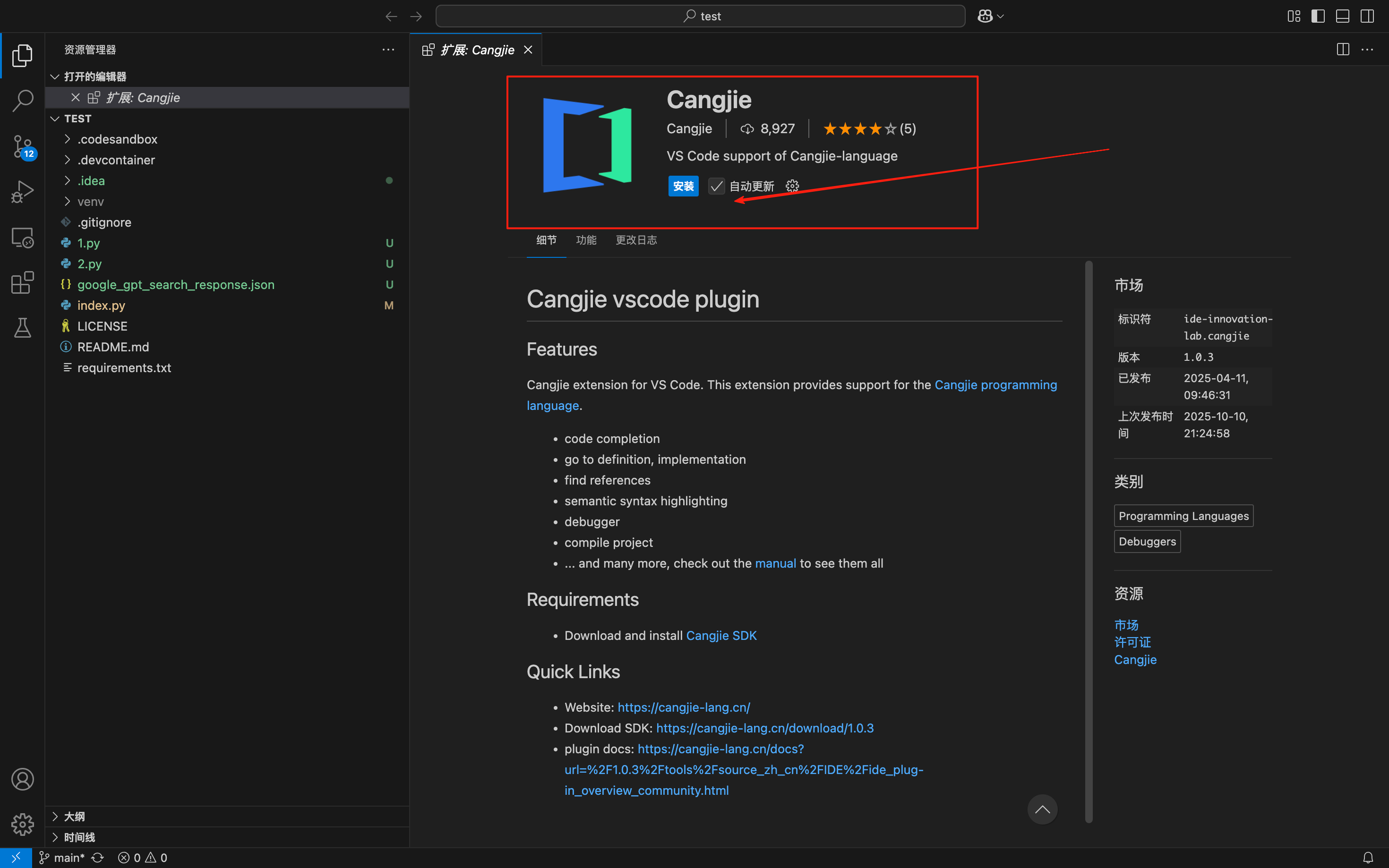 熟悉Python的小伙伴一定对 VSCode并不陌生,现在仓颉插件已经可以直接在VSCode上进行下载使用了,直接点击左侧边栏的扩展图标,在拓展处搜索“Cangjie”即可免费安装使用了,可以说是十分方便。