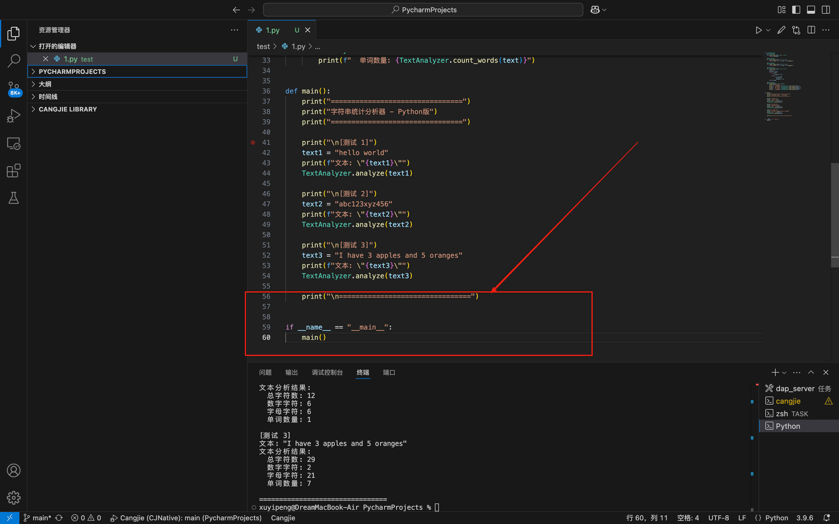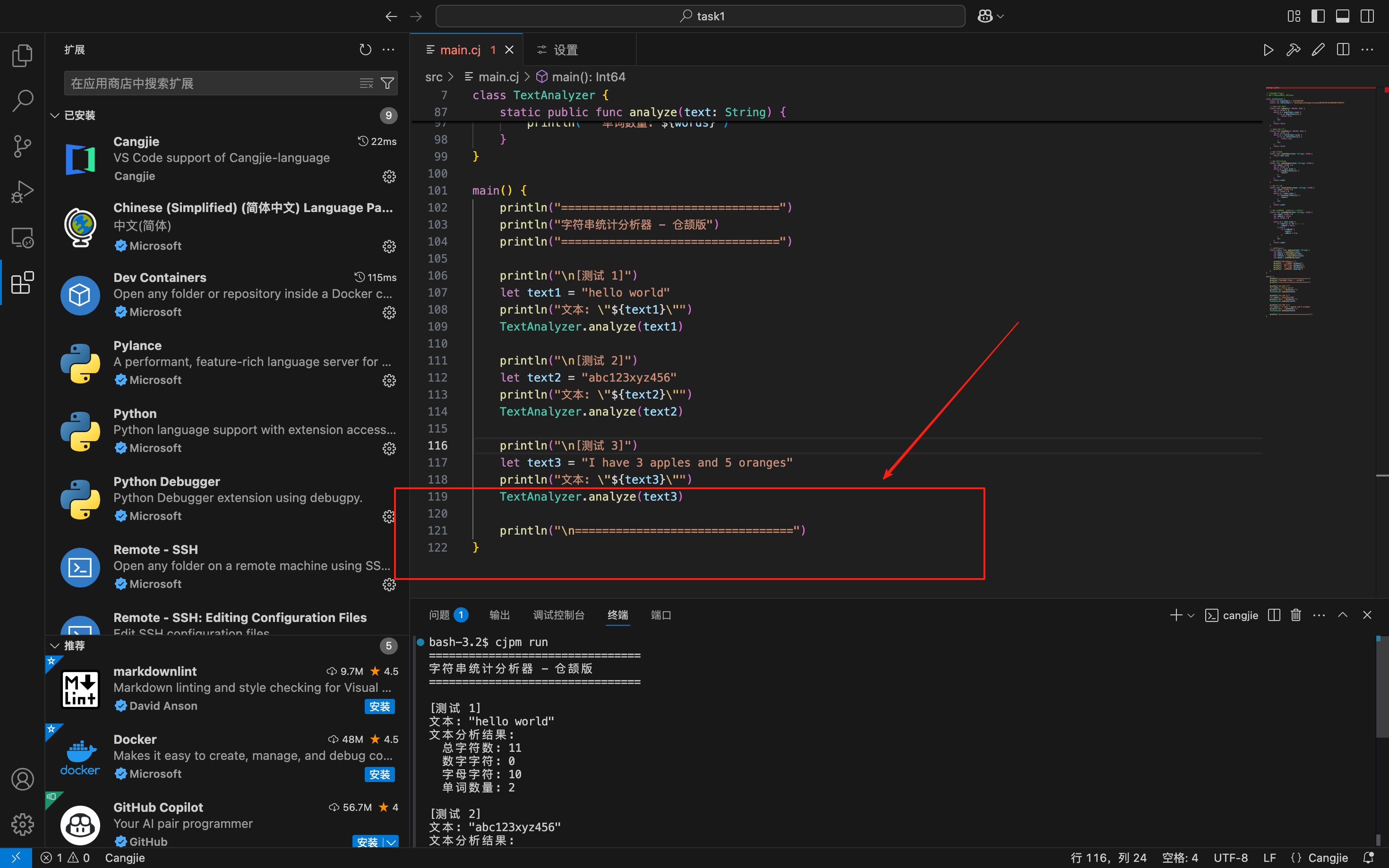 在决定尝试将Python项目迁移到仓颉时,我并没有选择那些动辄上千行的复杂系统,而是选了一个字符串统计分析器,说它简单,确实够简单。核心功能就是统计一段文本里有多少个字符、多少个数字、多少个字母、多少个单词。这种功能在Python里几乎是信手拈来的事情,len()、isdigit()、split(),三下五除二就能搞定。但正因为它简单,才更适合用来观察两种语言在最基础层面上的差异。