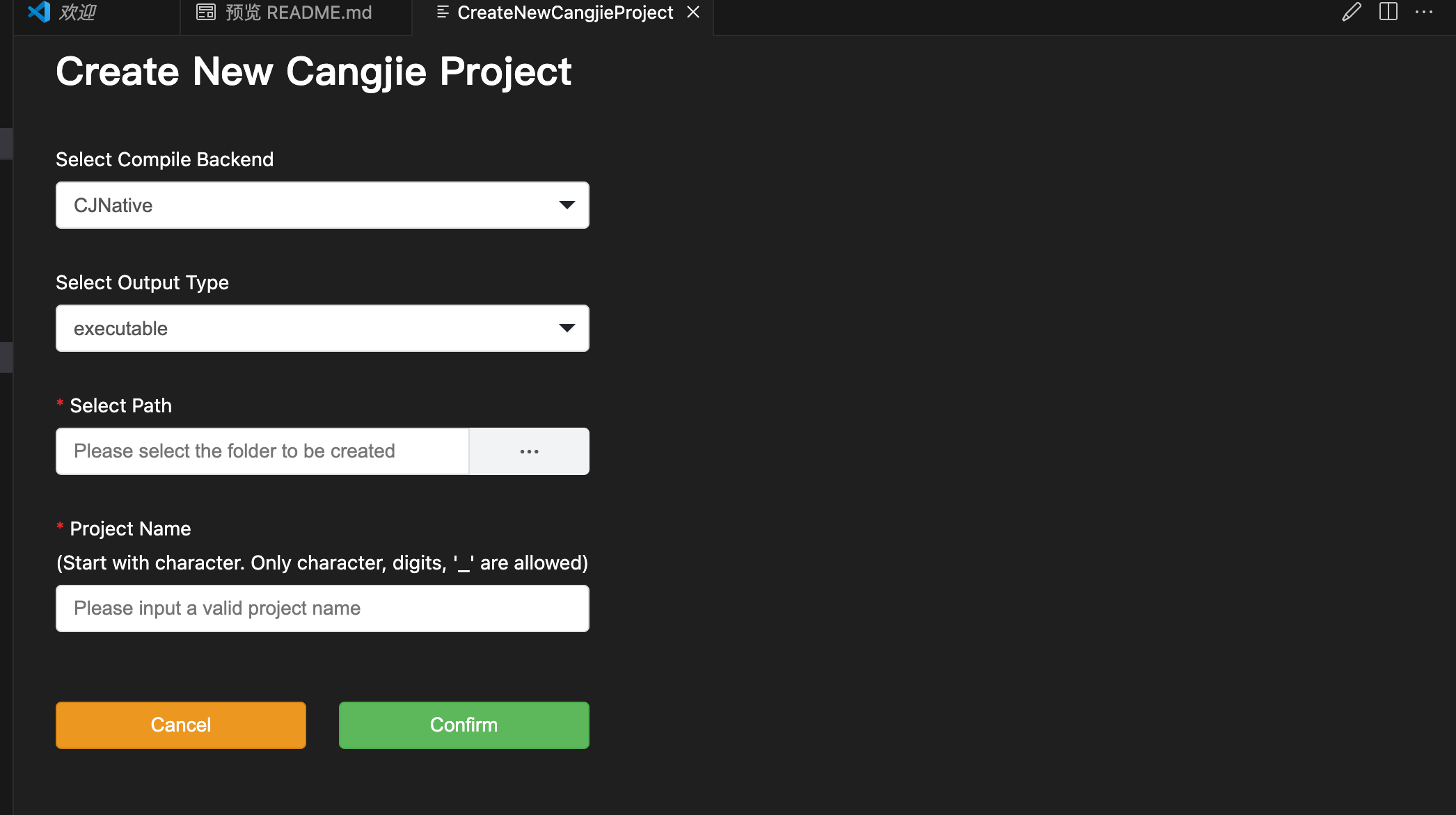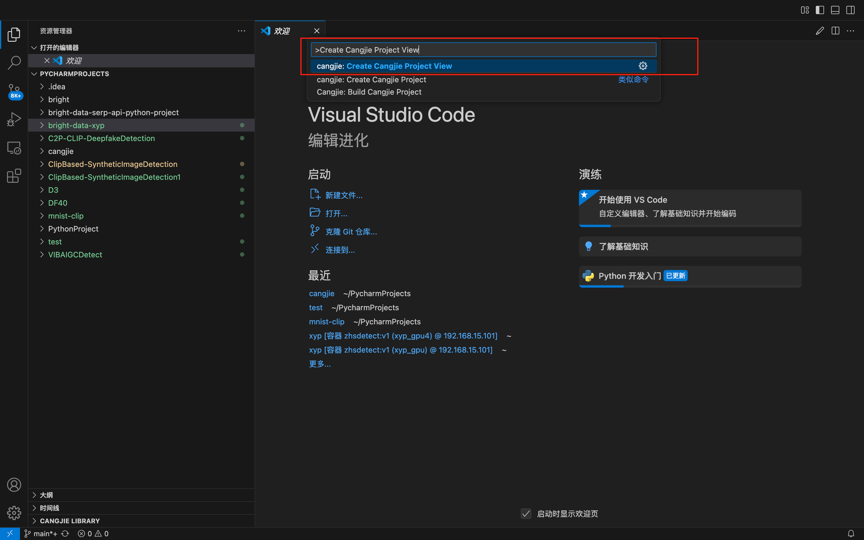 完成这些之后需要我们重启一下VSCode,才会生效。然后可以通过快捷键 Ctrl + Shift + P(macOS 系统的快捷键为 Command + Shift + P)调出 VSCode 的命令面板,选择 cangjie: Create Cangjie Project View 命令: