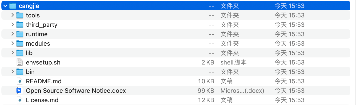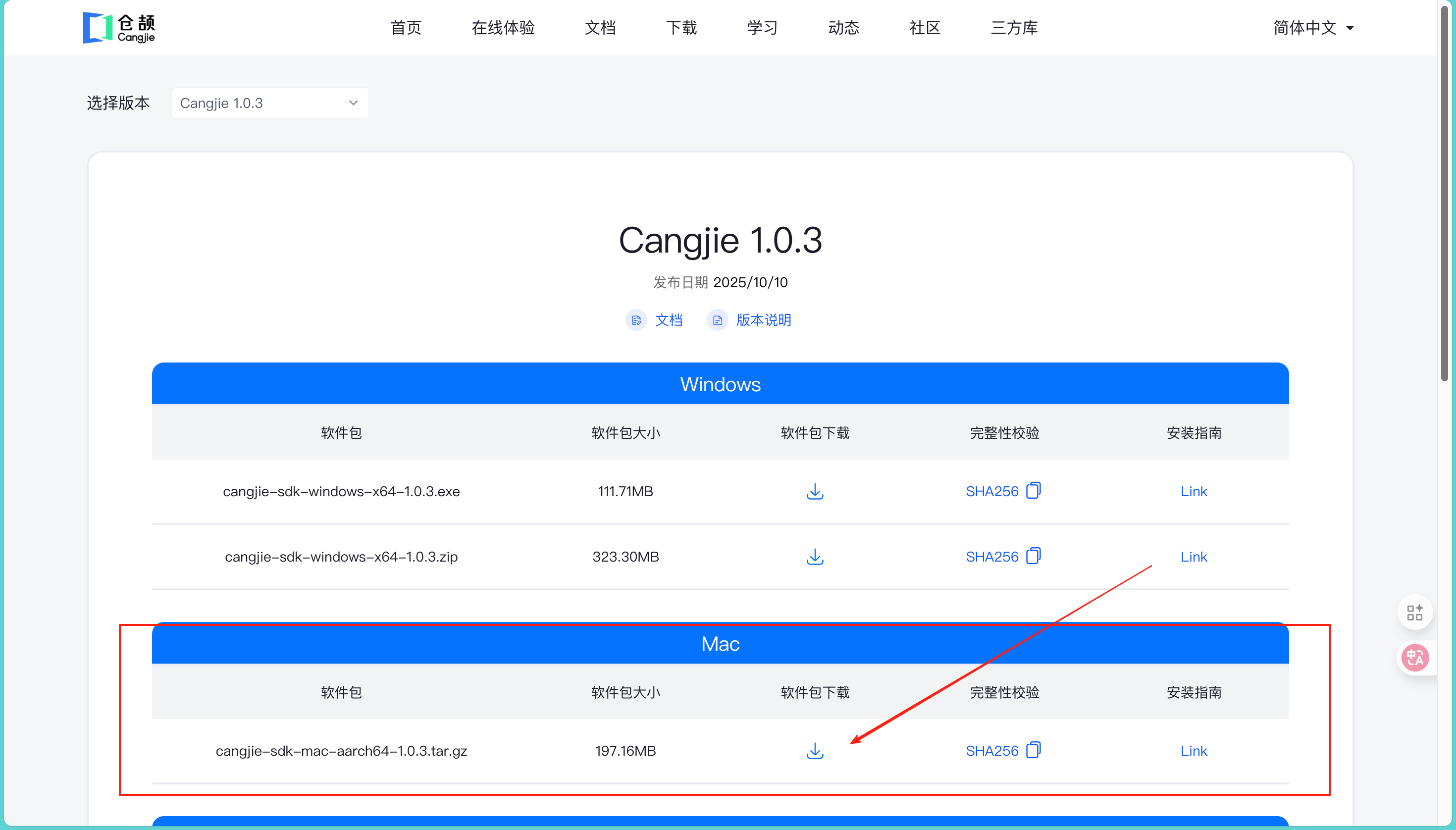 点击 Install 按钮安装完毕之后,需要我们去安装仓颉 SDK,其主要提供了仓颉语言编译命令(cjc)、仓颉语言官方包管理工具(Cangjie Package Manager,简称 CJPM),以及仓颉格式化工具(Cangjie Formatter,简称 cjfmt)等命令行工具。我们可以自行前往仓颉下载中心,手动下载仓颉 SDK。因为我自己的电脑是mac型号的,所以我只需要下面这个cangjie-sdk-mac-aarch64-x.y.z.tar.gz文件即可: