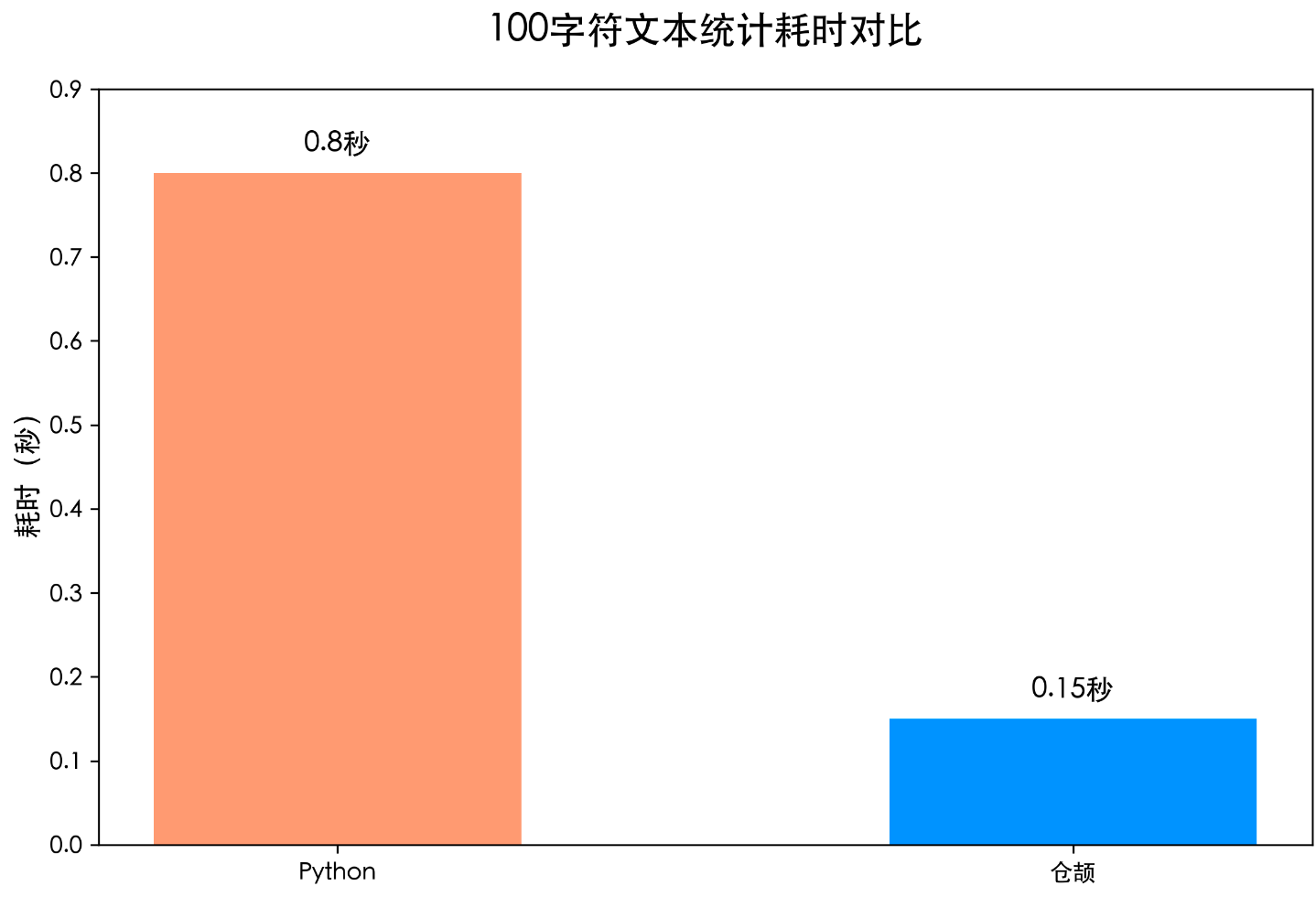 在文本测试中,仓颉的优势非常明显。统计100字符文本的所有指标(字符数、数字、字母、单词),Python平均耗时约0.8秒,而仓颉只需要0.15秒左右,性能提升超过5倍。