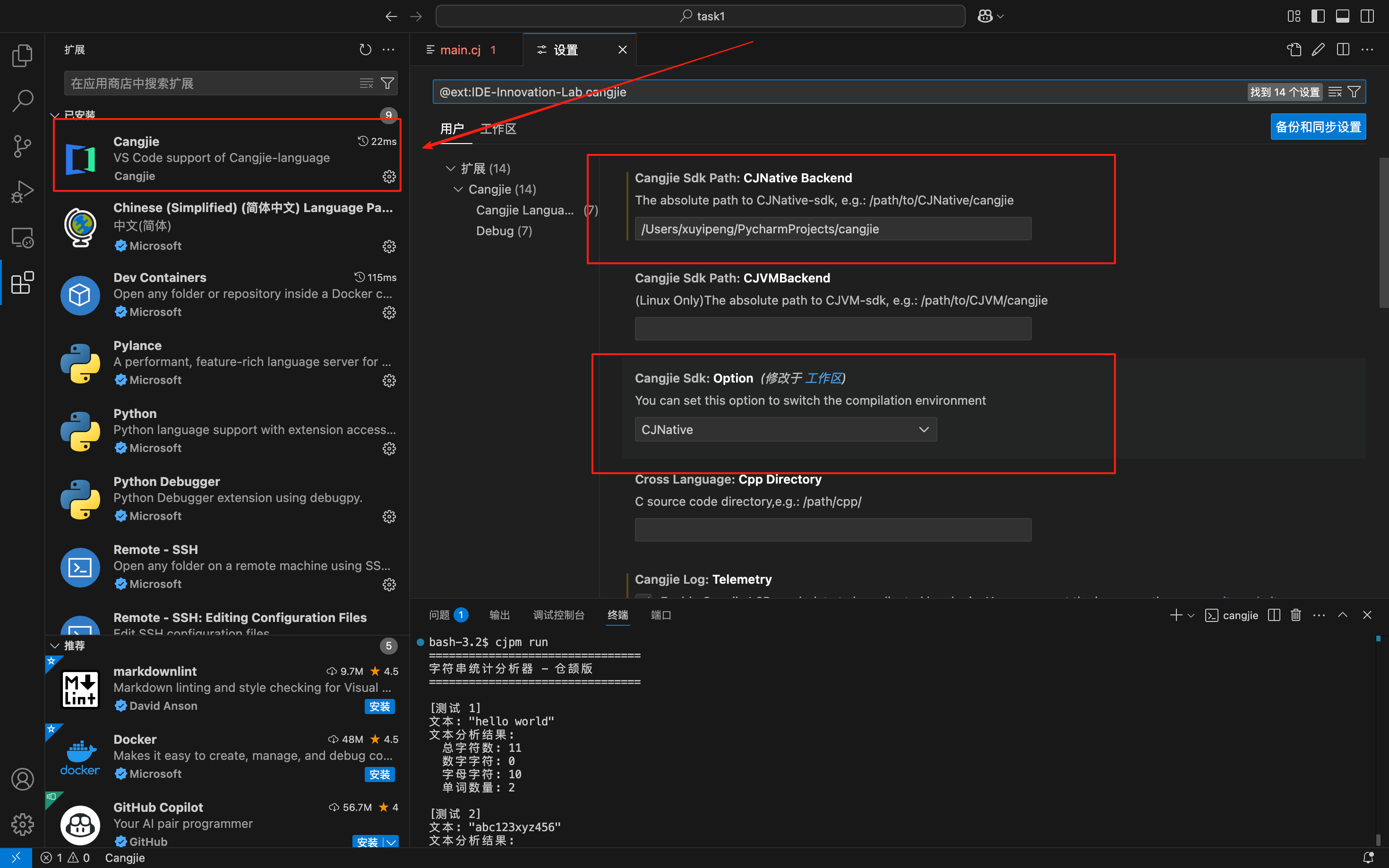 安装完仓颉插件后,即可配置 SDK 的路径,我们可以右键单击插件,选择 Extension Settings,进入配置页面,然后输入 CJNative 后端 SDK 文件夹所在绝对路径,以及选择后端类型为 CJNative:
