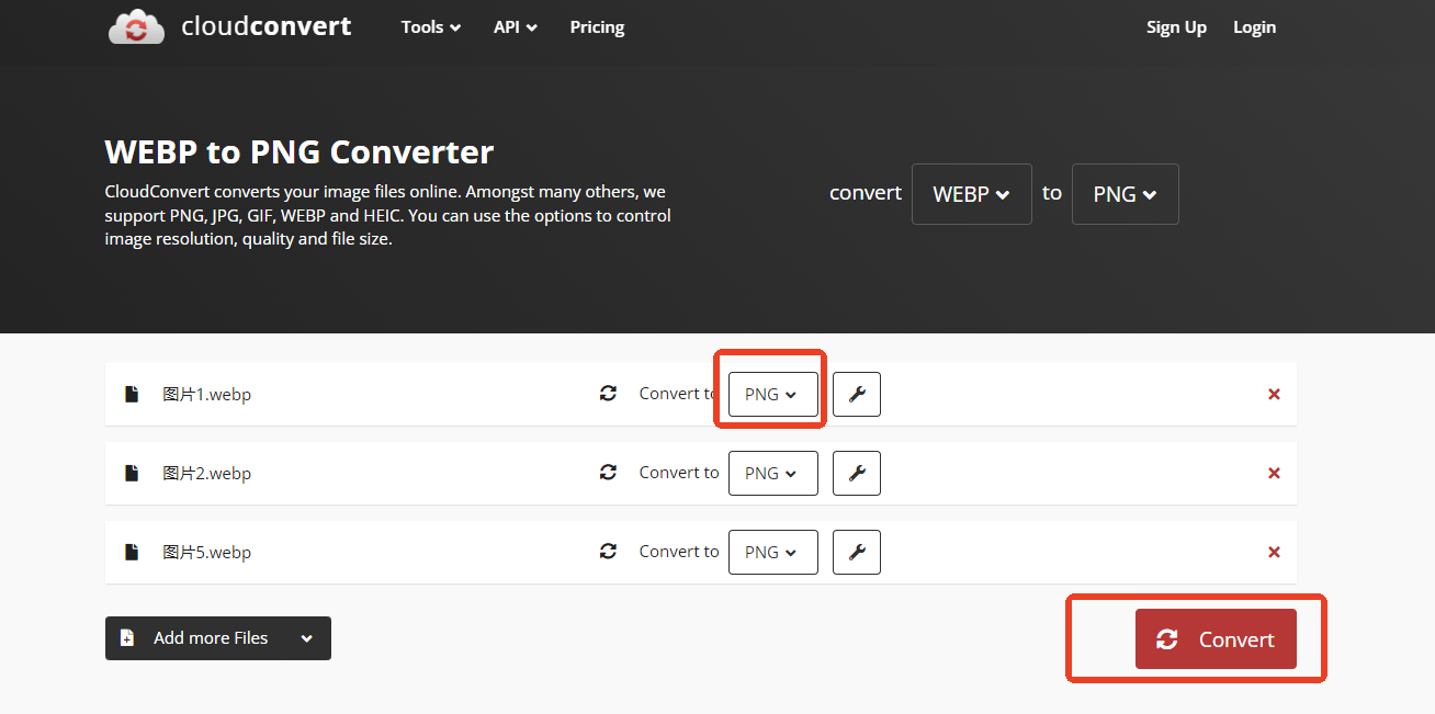 在浏览器中搜索打开该工具,点击上传webp文件、设置目标格式为png,最后点击按钮即可在线自动转换格式!