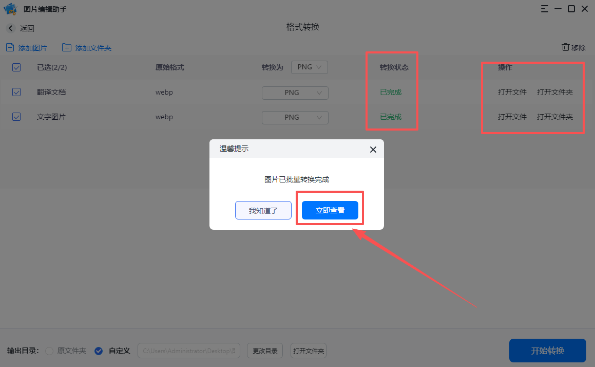 转换完成后,点击【立即查看】按钮就能直接打开PNG图片所在的文件夹进行查看!