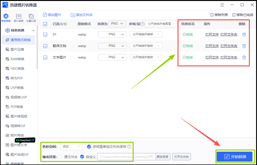 在下方设置色彩空间、勾选多帧图单独文件夹保存、设置保存文件夹,点击【开始转换】按钮就能转换图片格式!