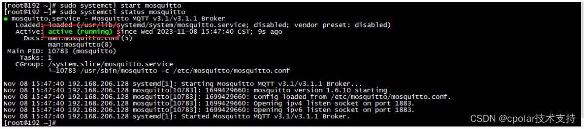 执行启动命令后,输入查看状态,我们可以看到服务已经运行成功了,本地安装成功了,下面安装cpolar工具,穿透Mosquitto 服务的本地1883端口,实现远程访问连接.