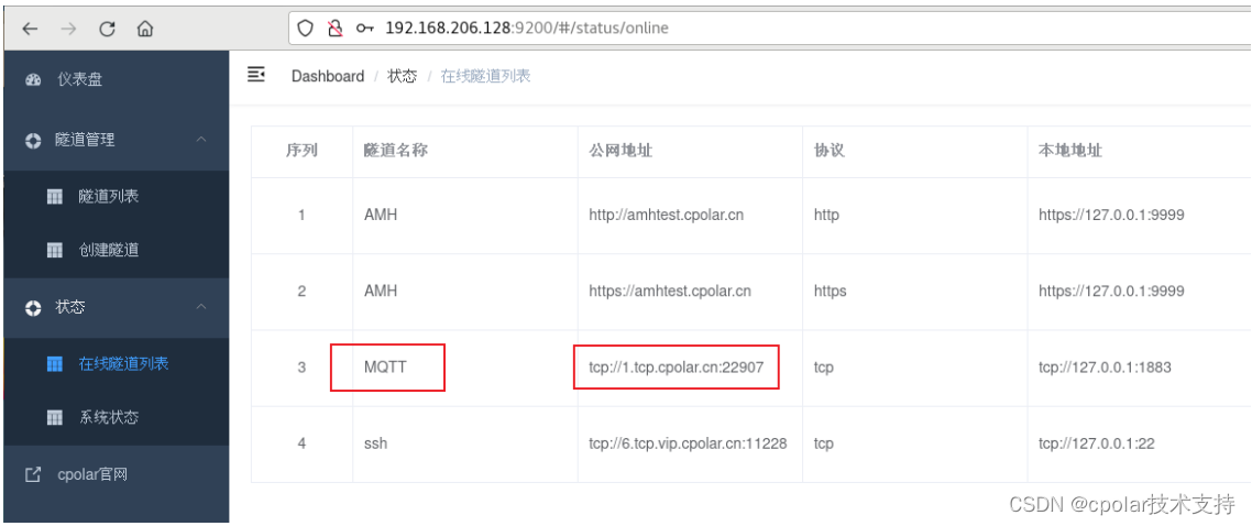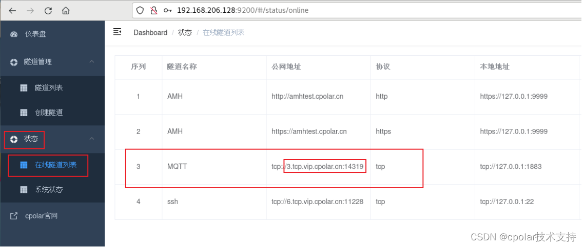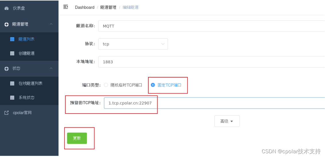 隧道更新成功后,点击左侧仪表盘的状态——在线隧道列表,可以看到公网地址已经更新成为了固定TCP地址。