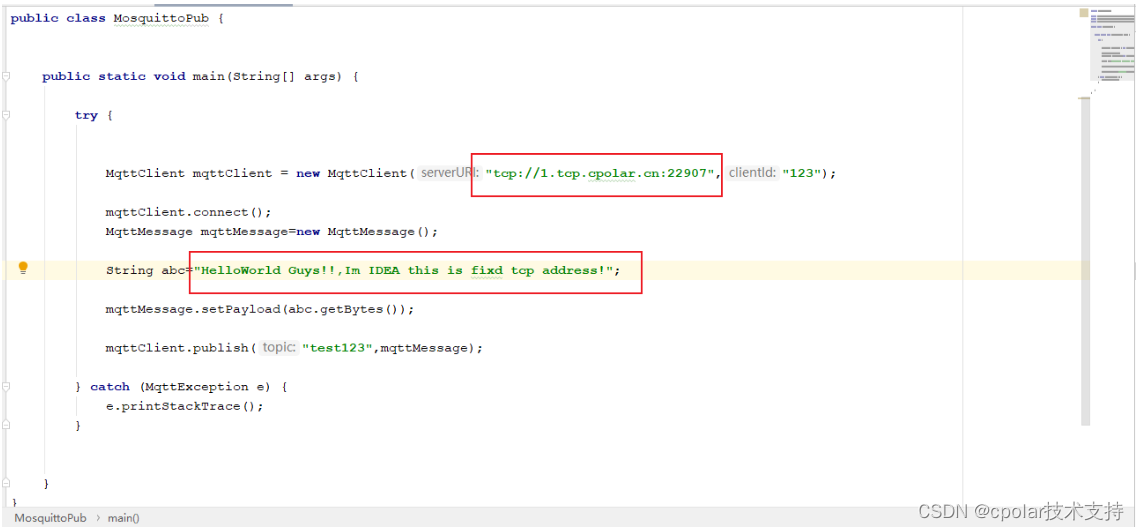 然后使用Cpolar 公网地址进行连接,输入ClientID,向同一个topic进行发布消息,当然,这边测试,地址是写在内部,如生产环境,建议将地址进行外部配置,有助于方便后续修改