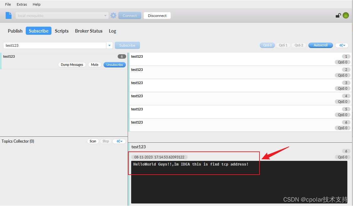 程序运行后,我们可以看到,在客户端Subscribe 界面工具上,看到了我们代码中发布的消息数据,也是可以连接测试成功