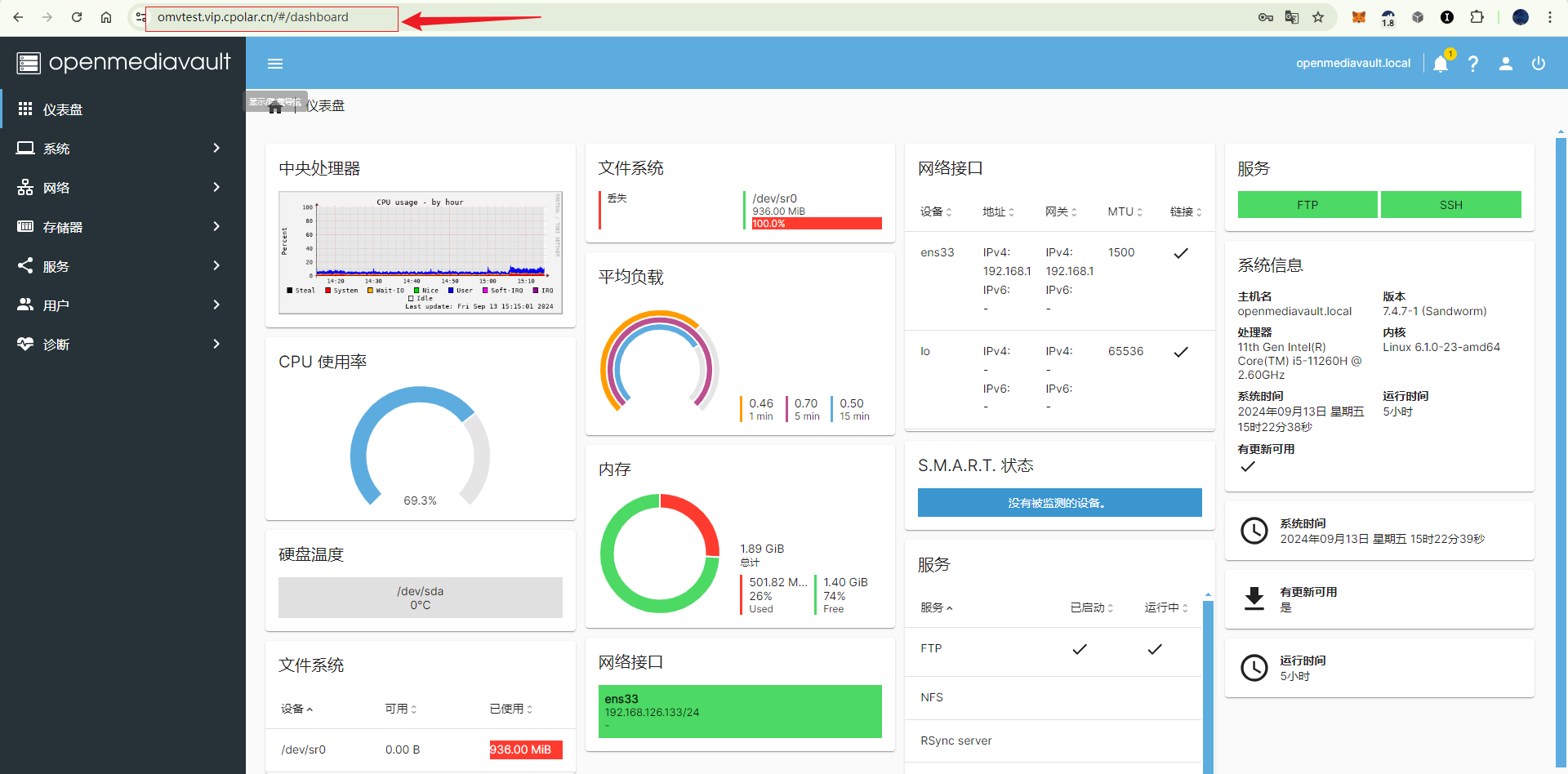 同样我们输入账号密码,即可成功登录,这样一个远程访问的公网地址就设置好了,使用这个公网地址域名可以在任意浏览器进行访问OpenMediaVault .
