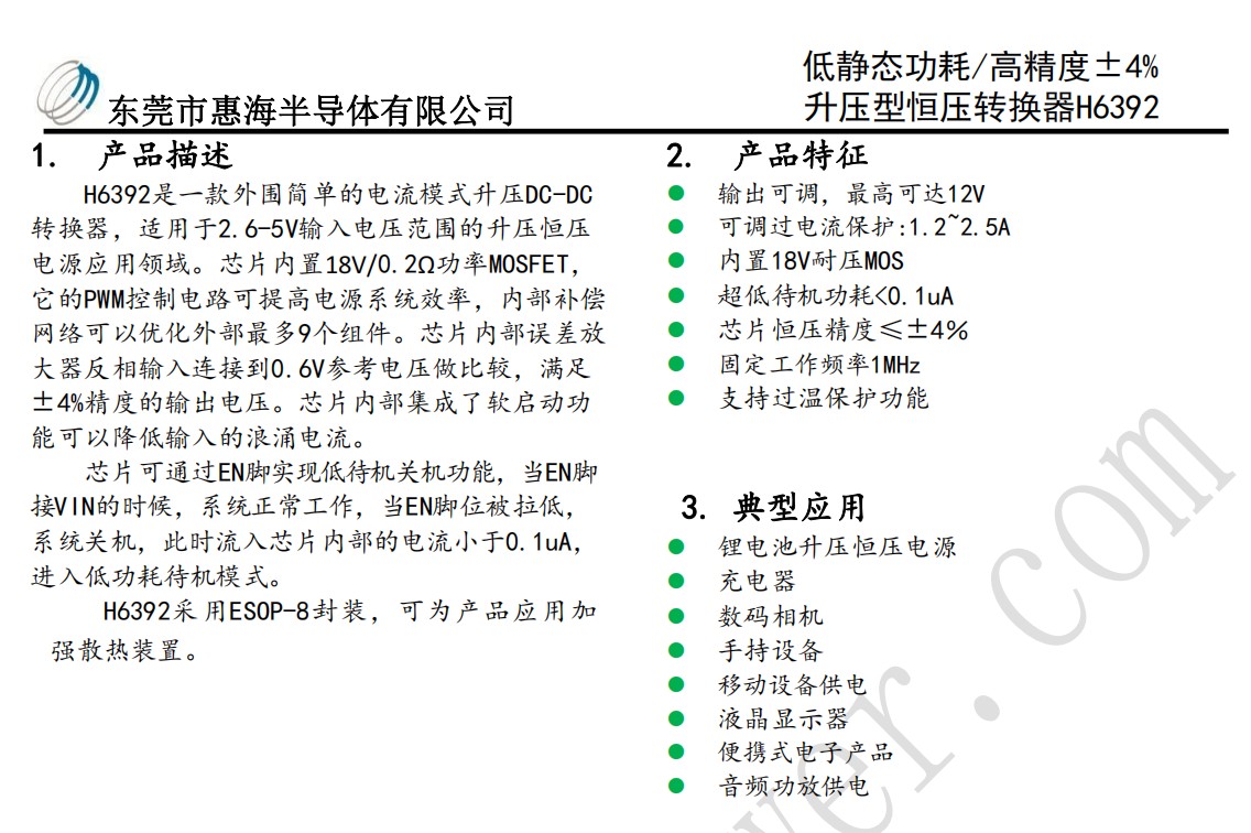H6392 是一款外围电路精简的电流模式升压 DC-DC 转换器,适用于 2.6-5V 输入电压的升压恒压电源场景,尤其适配无线充设备的供电需求 —— 能将锂电池等低压输入(如无线充内置的 3.7V 电池)稳定升压至无线充发射模块所需电压,为线圈耦合供电提供可靠支持。