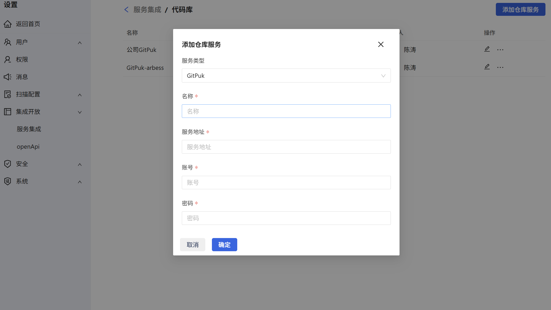 在系统集成中添加GitPuk,输入对应内容点击确定即可