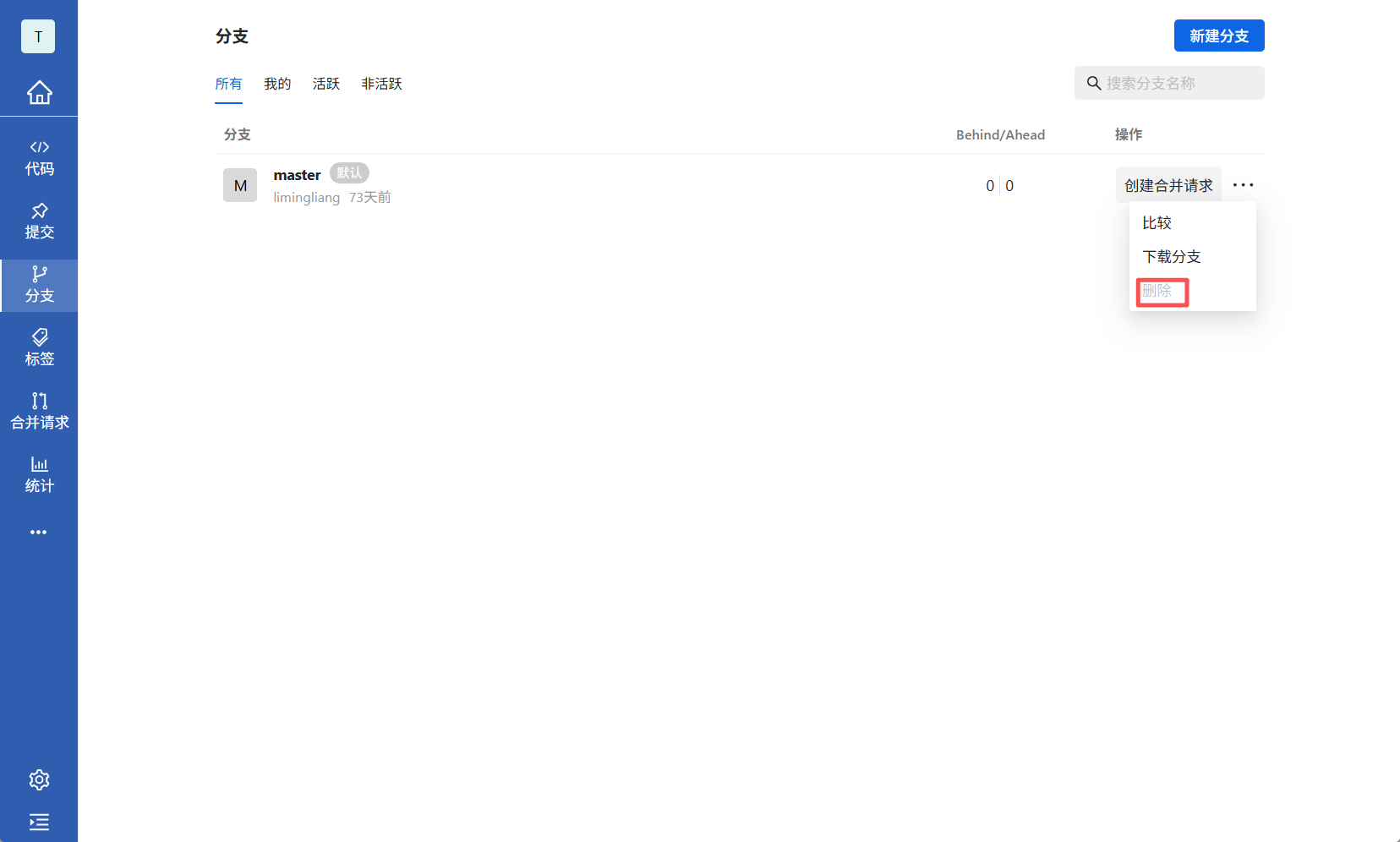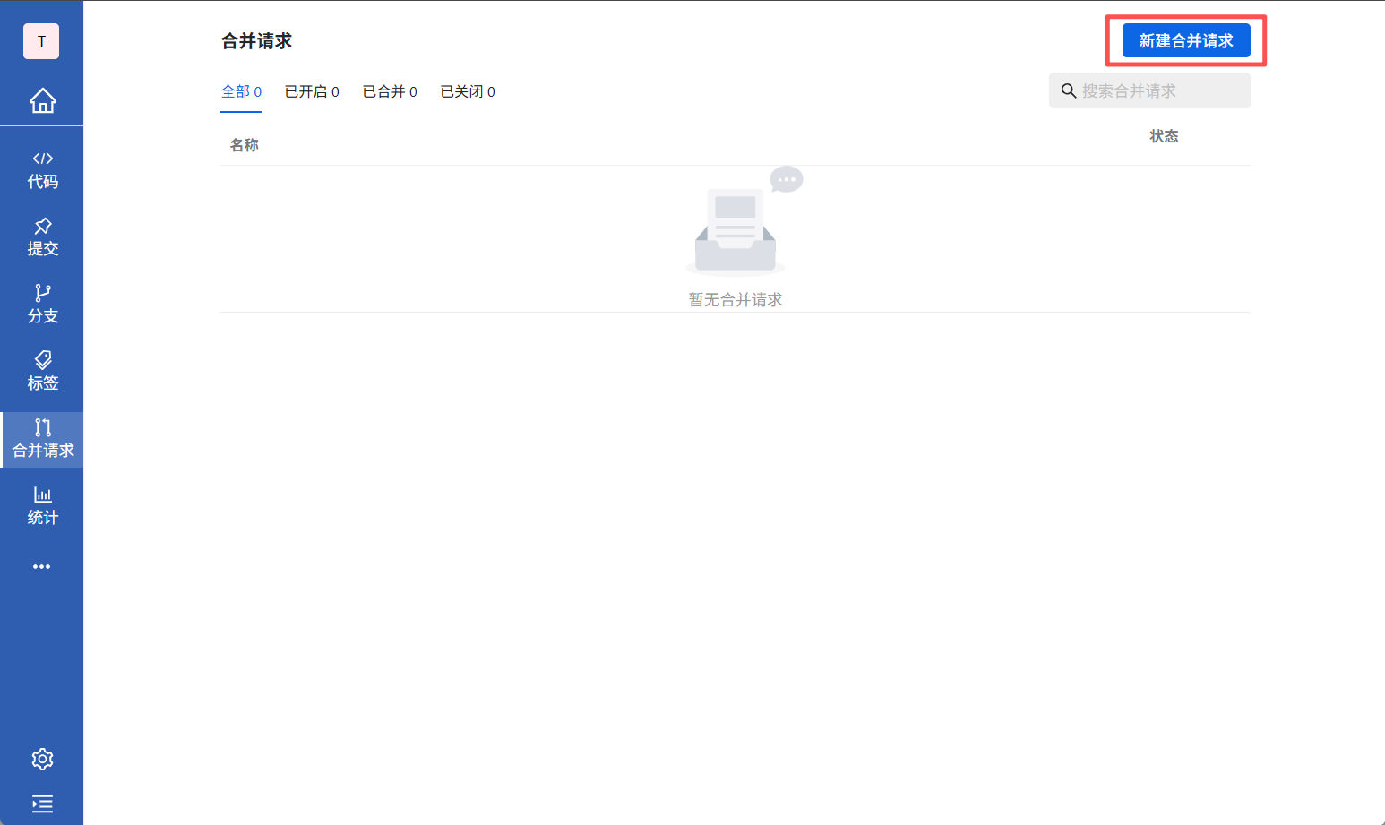 1.进入合并请求界面,点击新建合并请求按钮进入创建合并请求的界面。