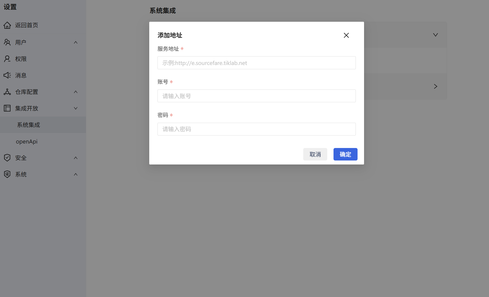 在系统集成中添加sourcefare,输入对应内容点击确定即可