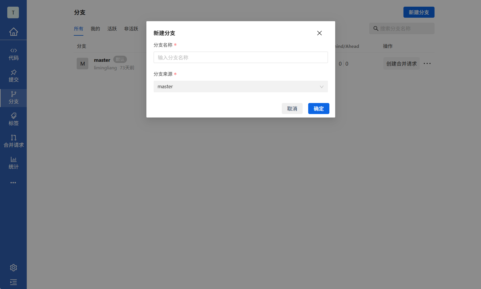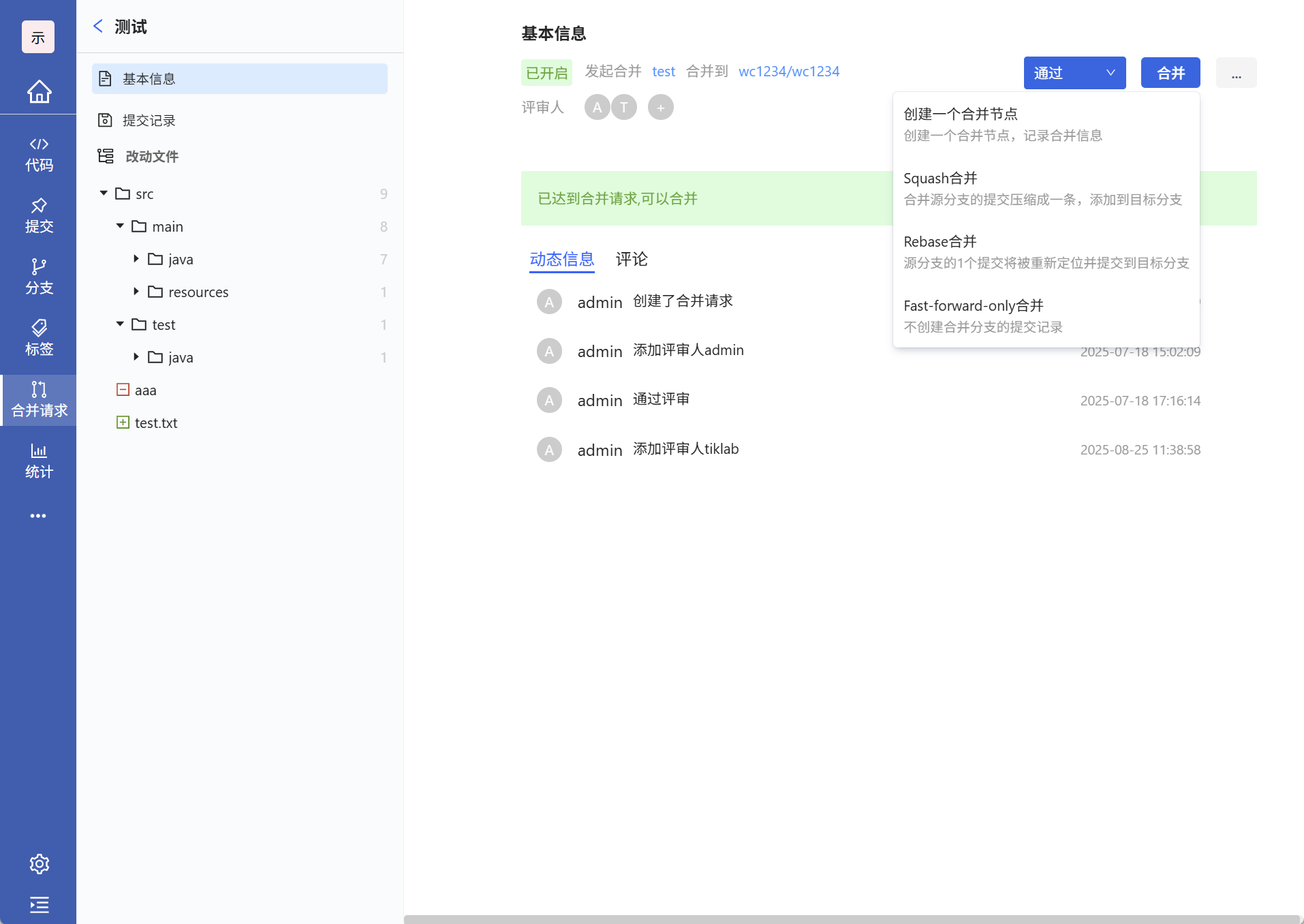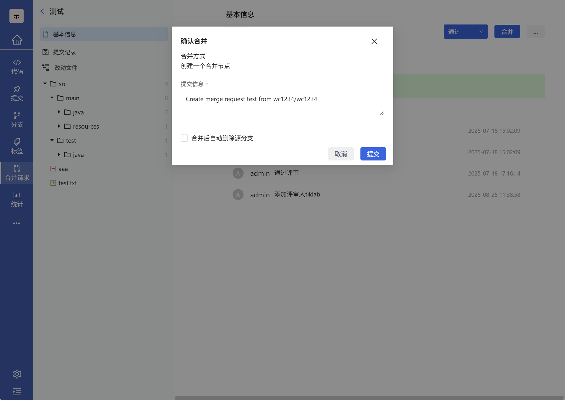 2.选择合并类型,打开确认弹窗,点击提交执行合并,合并后是否删除源分支,默认不删除。